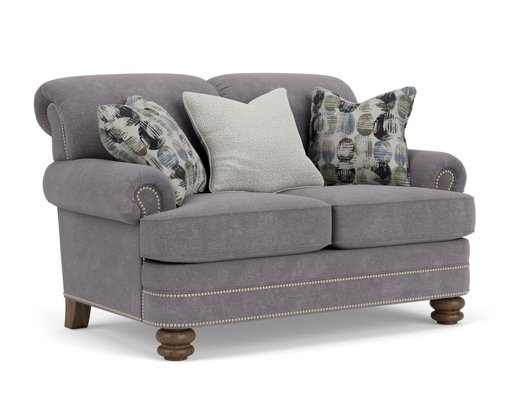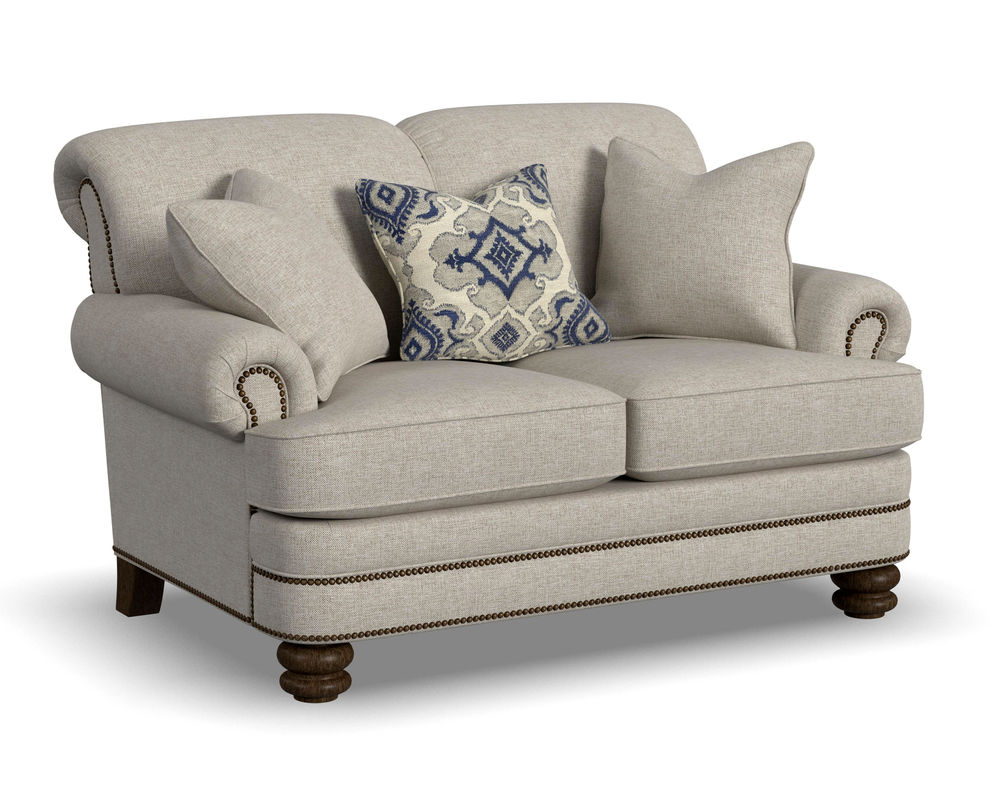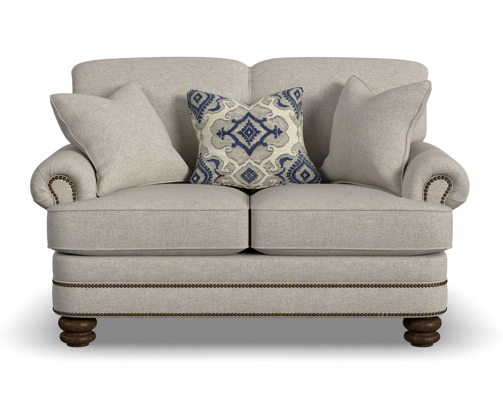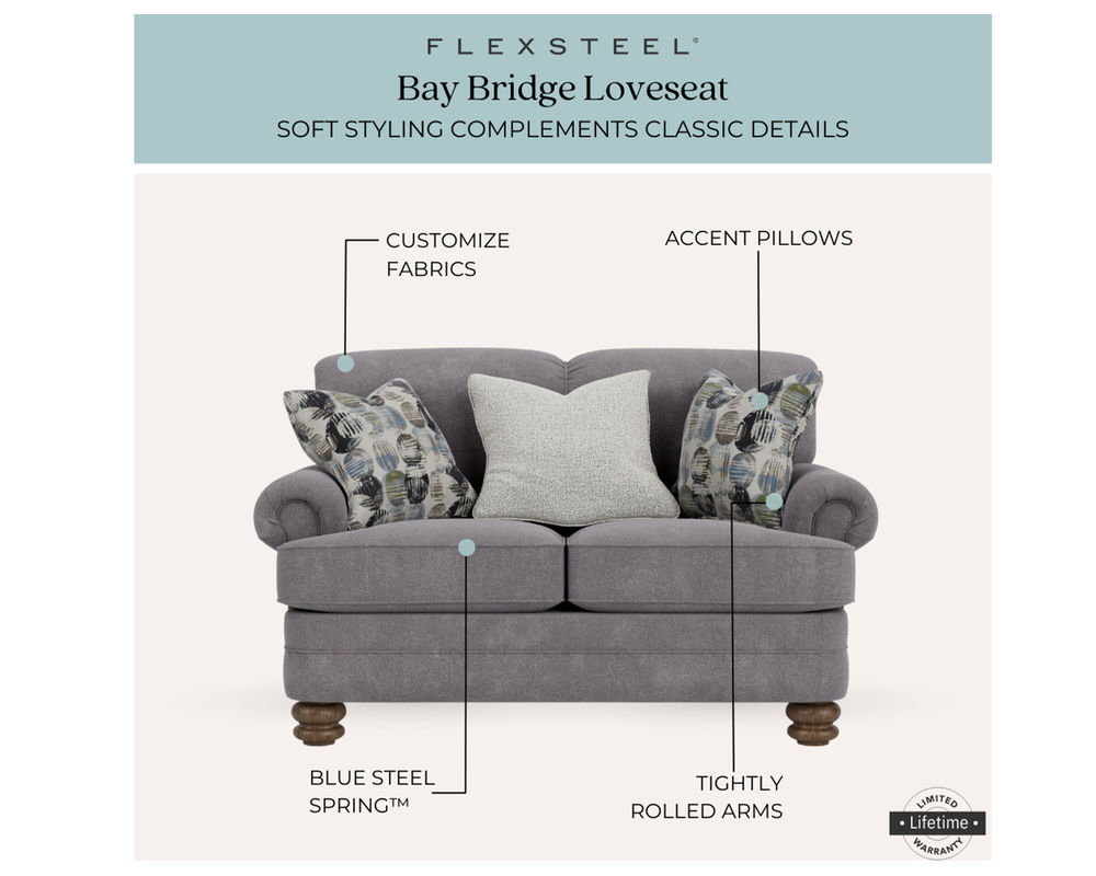 This Flexsteel Bay Bridge 7791 Nailhead Loveseat is the perfect blend of classic and contemporary style. With softly styled details, this loveseat is sure to become a treasured piece of furniture. It features tightly rolled arms, a rounded front rail, back and side panels lined with a welt cord, and round bun feet, creating an heirloom look. It also comes with a choice of over 100 high-performance and standard fabrics. With free shipping included, this loveseat is a great value. For an added touch of sophistication, nailhead trim is included. This loveseat is sure to bring timeless style to any home.