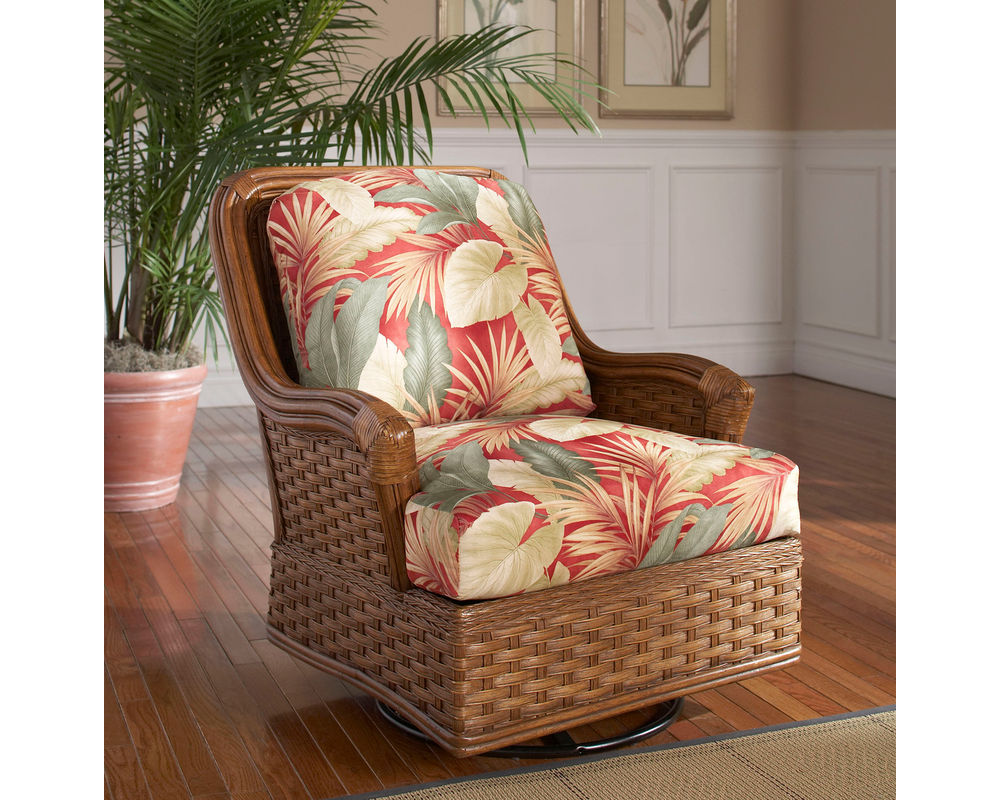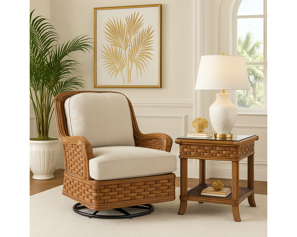 The Somerset Rattan Swivel Glider combines timeless coastal style with the soothing comfort of gentle motion. Designed with reeded rattan details and gracefully flared wood feet, this piece brings tropical elegance into any living space. Handcrafted in the USA, it features a Comfort Spring seat cushion for superb support and durability, along with the versatility of a full swivel and smooth gliding action. Customizable fabrics and finishes allow you to create a look tailored to your home.