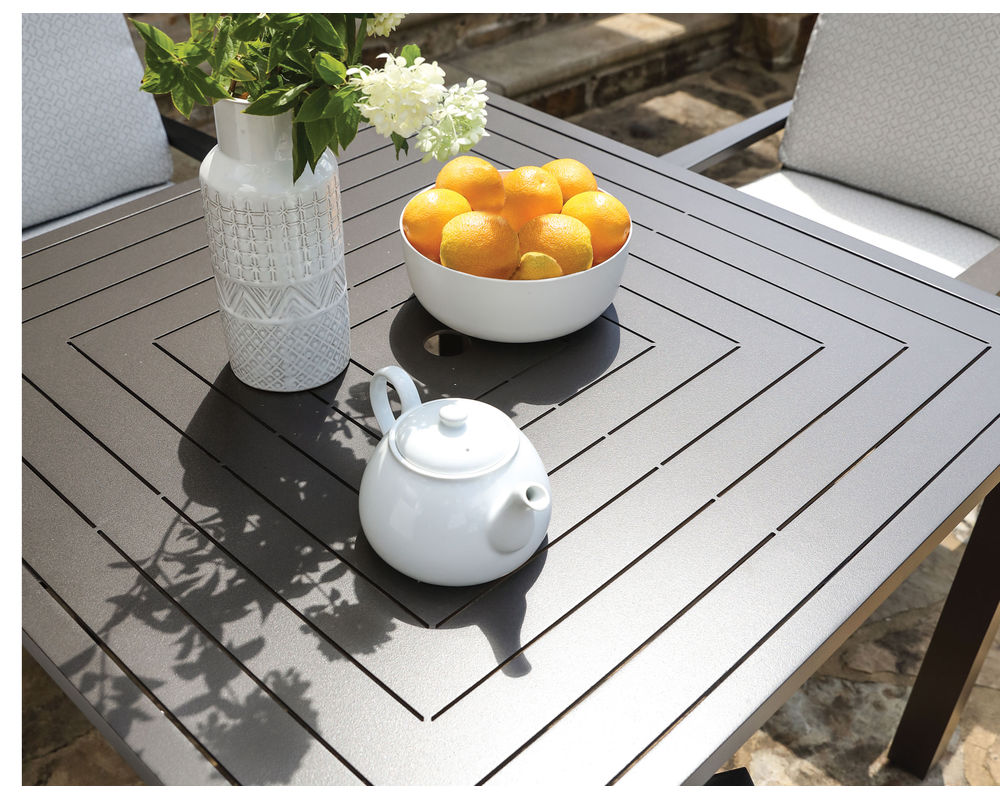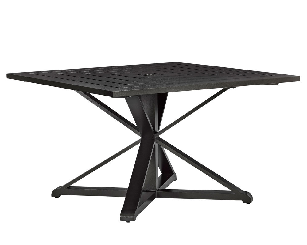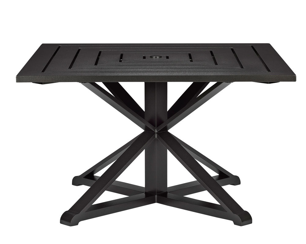 • FRAME: Constructed of weather-resistant tubular and cast premium powder-coated aluminum. • Trestle style base and slatted tops. Hand-rubbed powder coated finish. Seats 4. 1.875” Umbrella hole. Table has built in umbrella base.