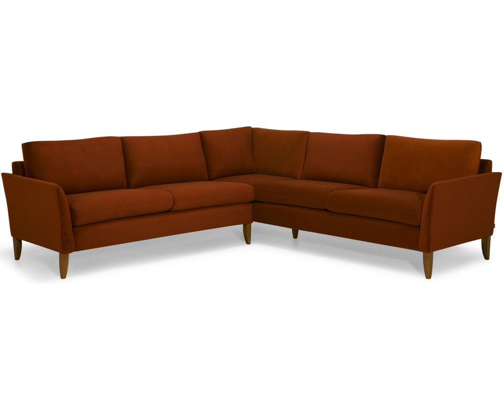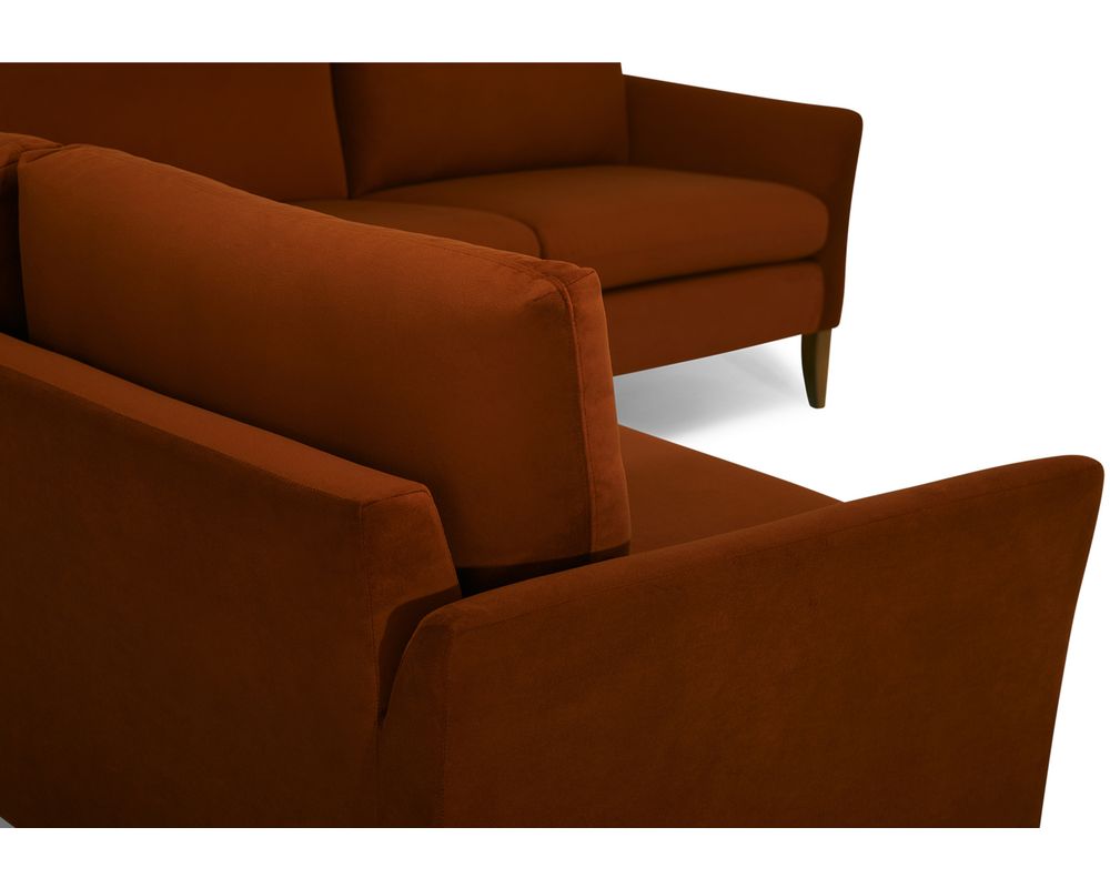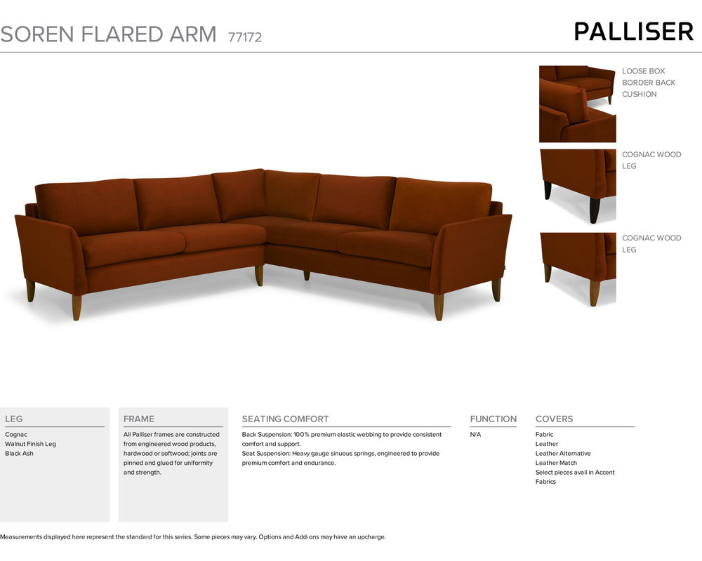 Introducing the Soren 77172 Sectional, the perfect addition to any living space. Soft and elegant, this sectional boasts a small-scale design with subtle feminine touches. The standout feature is its arced arms, which add a touch of flair to the overall look. The sectional is elevated by high solid wood legs in a rich cognac finish, giving it a sophisticated touch. Rest assured, the Soren 77172 Sectional is crafted with the highest quality materials, ensuring its durability and comfort.