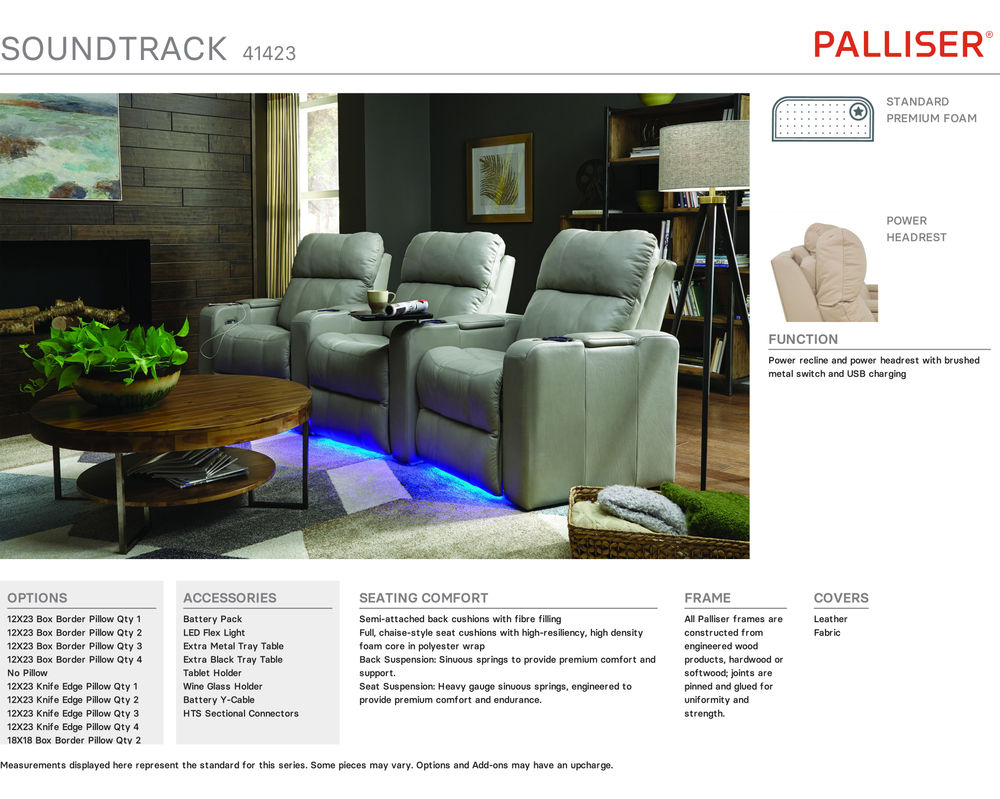 The Soundtrack collection features ultra-plush back cushions that are pillow-soft and will embrace you with warmth and comfort. The bucket-style, high-resiliency seat foam provides unparalleled comfort and support, whether sitting or reclining, that lasts for years, giving you peace of mind about your investment.