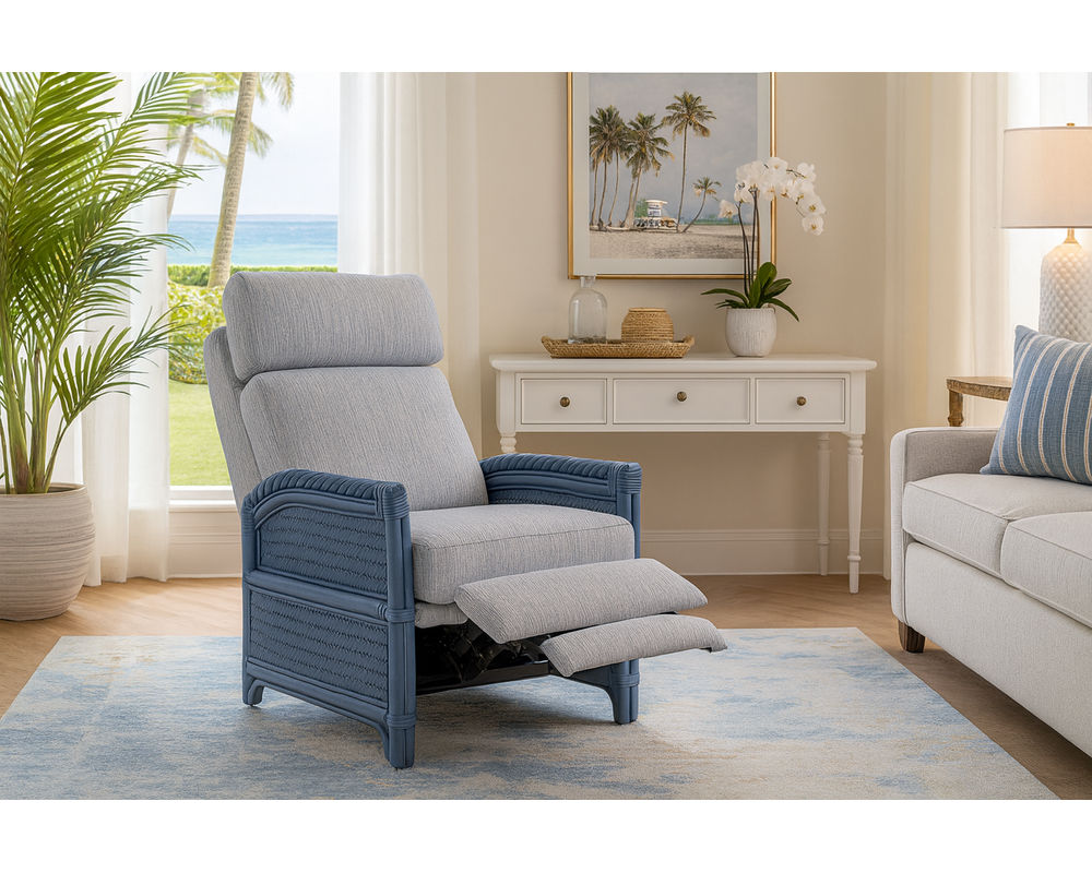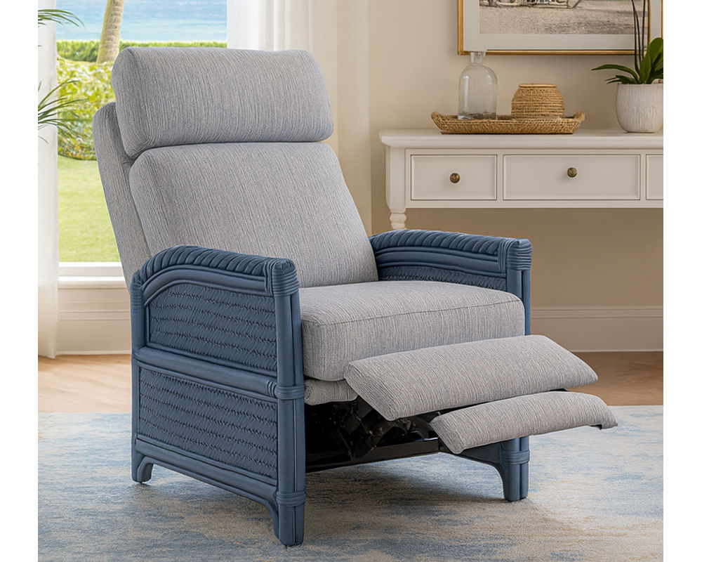 Bring the laid-back elegance of coastal living into your home with the South Shore High Leg Recliner. Designed with hand-woven rattan details and a sturdy frame finished in a soft nautical blue, this recliner blends refined craftsmanship with casual comfort. The high-leg silhouette keeps the look clean and sophisticated, while the plush cushions in performance fabric provide sink-in relaxation that lasts. Perfect for coastal cottages, modern sunrooms, or any living space that embraces breezy, relaxed luxury.