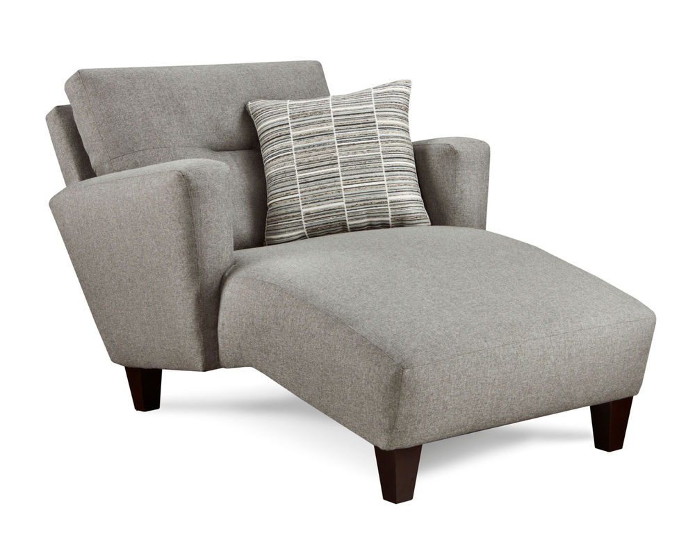 The TNT Charcoal Chaise is a mid-century modern lounging chair with a tufting to the inside back pillow and a unique sloped track arm down to the coffee finish tapered wood legs. The inside back pillows and box border seat cushion is bent at the knees to sit ergonomically correct and comfortable. This slightly smaller scaled sofa is curvaceous and great looking as a stand-alone piece or with our TNT Charcoal sofa group.