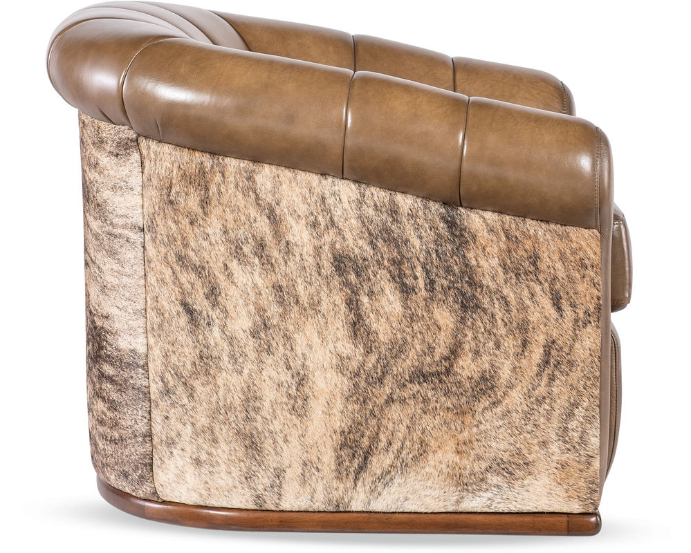 Elevate your living space with the Spencer Swivel Chair, a statement piece that combines sophisticated design with inviting comfort. Showcasing a barrel-back silhouette with channeled detailing, rolled arms, and contrasting hair-on-hide accents, this chair exudes rustic elegance with a modern twist. Upholstered in semi-aniline leather for a supple, luxurious feel, the Spencer chair sits atop a smooth swivel base, offering flexibility and ease of movement. Perfect for both transitional and contemporary interiors, it brings a refined yet relaxed vibe to any room.