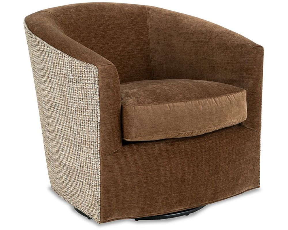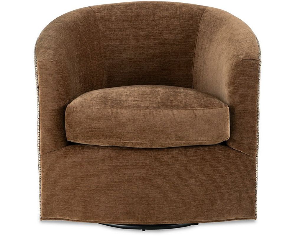 The Suffolk 0598 brings a soft, sculptural presence to casual modern spaces with its inviting barrel-chair silhouette and gently sloped track arms. Available as either a swivel or swivel glider, this chair is designed for relaxed comfort and everyday durability. A reversible seat cushion and Down Blend Cloud Cushions deliver a luxurious sit, while an extensive selection of high-performance fabrics makes it easy to tailor the look for busy households. Fabric and leather combination options are available by special order.