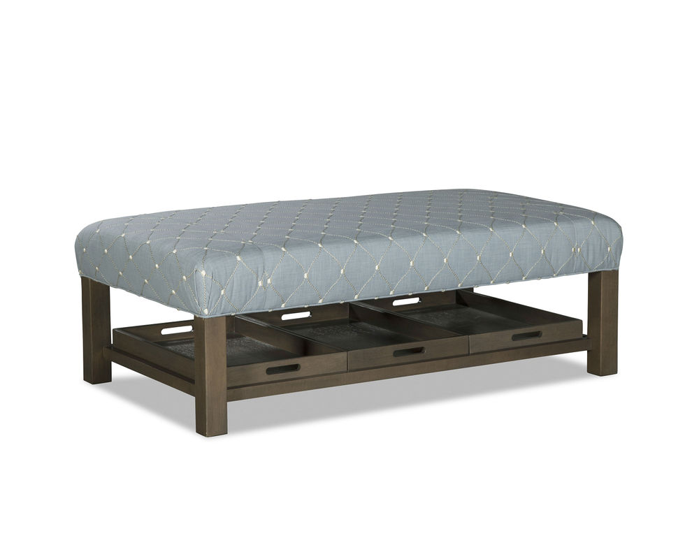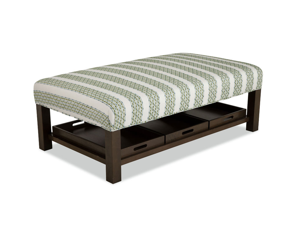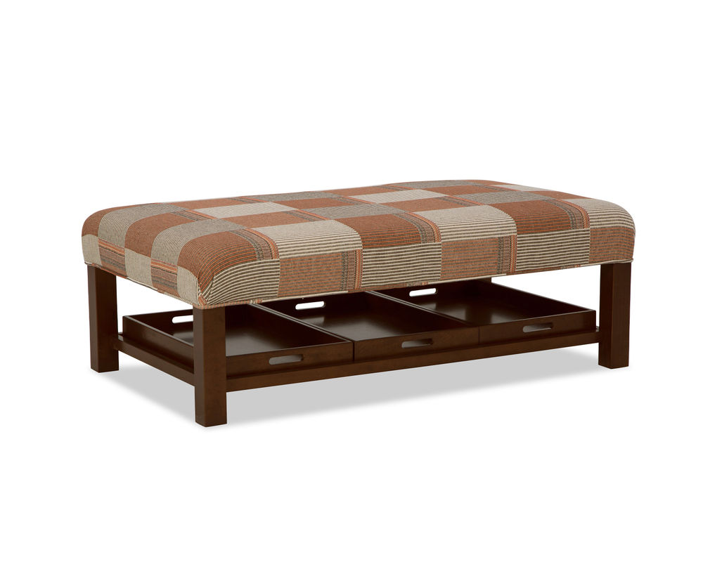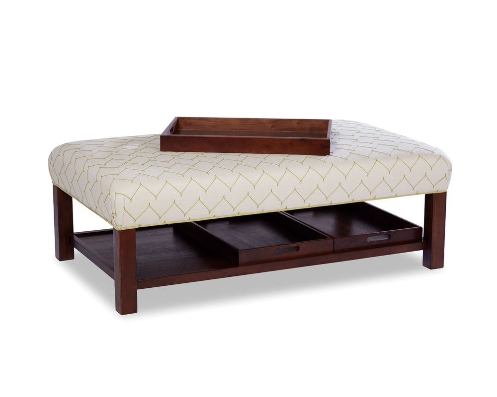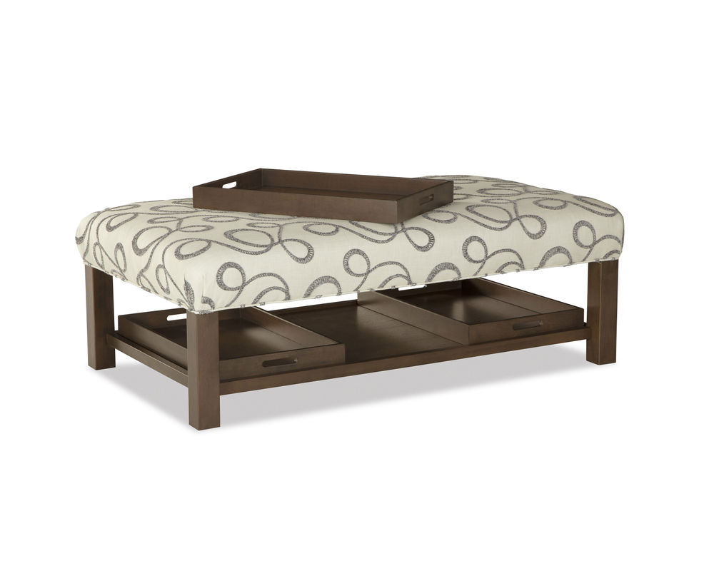 You'll love this generously scaled cocktail ottoman for it's looks, but you'll really enjoy its functional side too. A part of the Paula Deen Home collection, it features a plush top and handsome transitional lines. But hidden underneath is the real prize- a trio of matching trays - perfect for snacks, beverages, or even a game. Use them anytime or all the time! Available in any finish, any fabric! Over 100 performance fabrics.