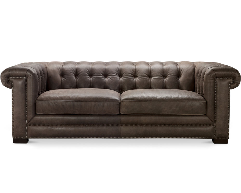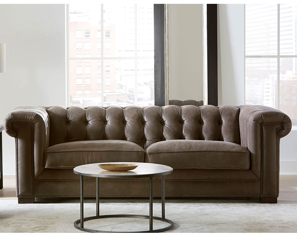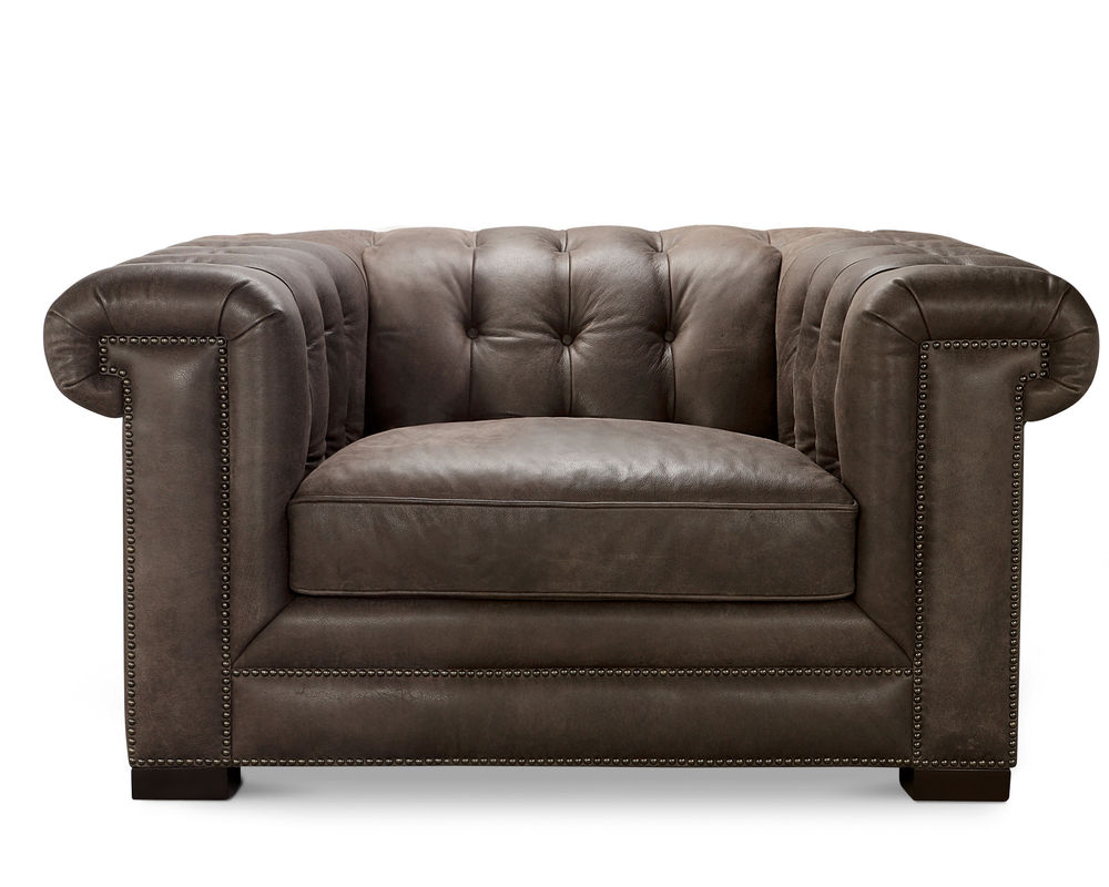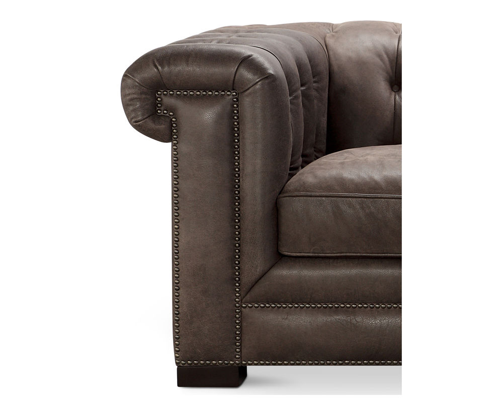 In Stock - Delivers is About 30 Days. Introducing the Sundance Leather Chair - a timeless, classic piece that will bring style and comfort to your home. The Sundance Cocoa is a beautiful Chesterfield chair with a stylish button-tufted back and shelf arms. It is upholstered in pure aniline full grain, top grain leather, and completed with a double row of beaded antique brass nailheads along the bottom front rail and up both arm posts.