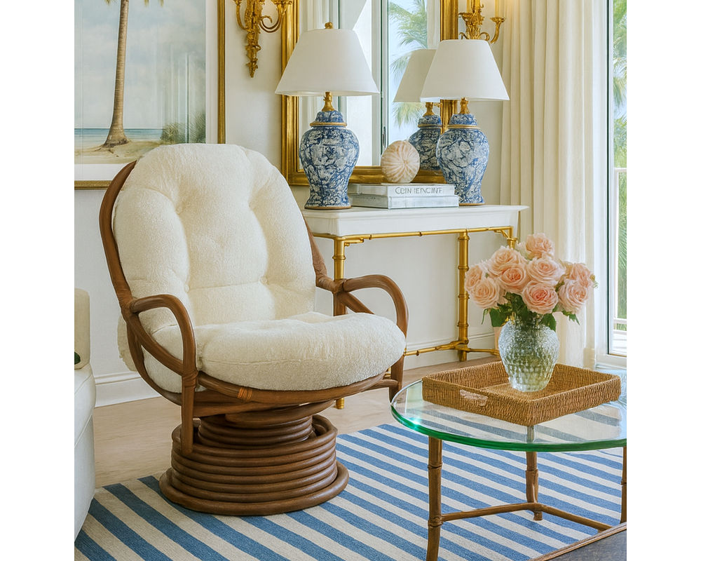 The Sunset Lounge Rattan Accent Chair is designed for those who love to unwind in effortless style. Featuring a beautifully hand-bent rattan frame and a plush tufted cushion, this chair combines casual island charm with superior comfort. Its wide seat and gentle curves invite hours of lounging, reading, or conversation, while the durable swivel base ensures smooth movement. Perfect for sunrooms, living rooms, or covered patios, the Sunset Lounge brings a relaxed resort feel into your home.