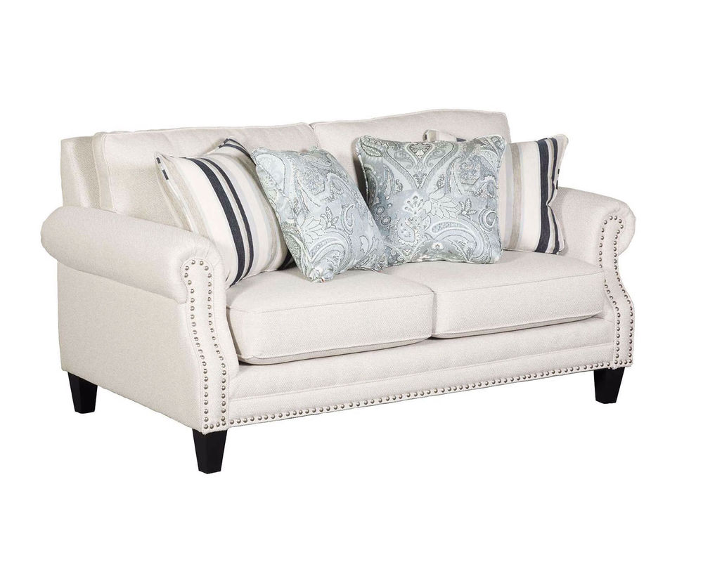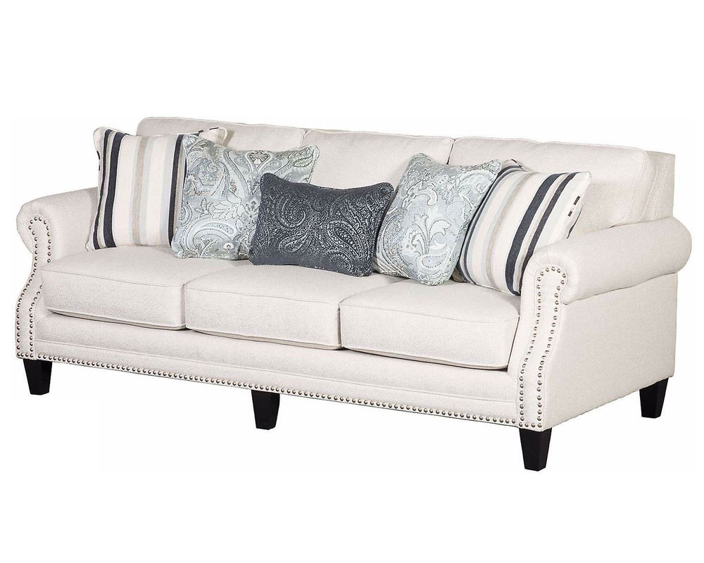 The Sweater Bone Sofa comes with 2 pairs of pillows beautiful contrasting fabrics in a paisley pattern and a colorful stripe. It features box border seat cushions and inside back cushions that are loose and reversible giving you the ability to rotate them that will prolong the life of the cushion cores and fabric. It has a recessed rolled arm with platinum nailheads that accent the arm posts and bottom front base-rail. It also features tapered wood legs in a beautiful coffee finish. Sweater Bone performance fabric will give you longer wear and better stain resistance.