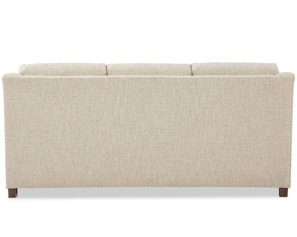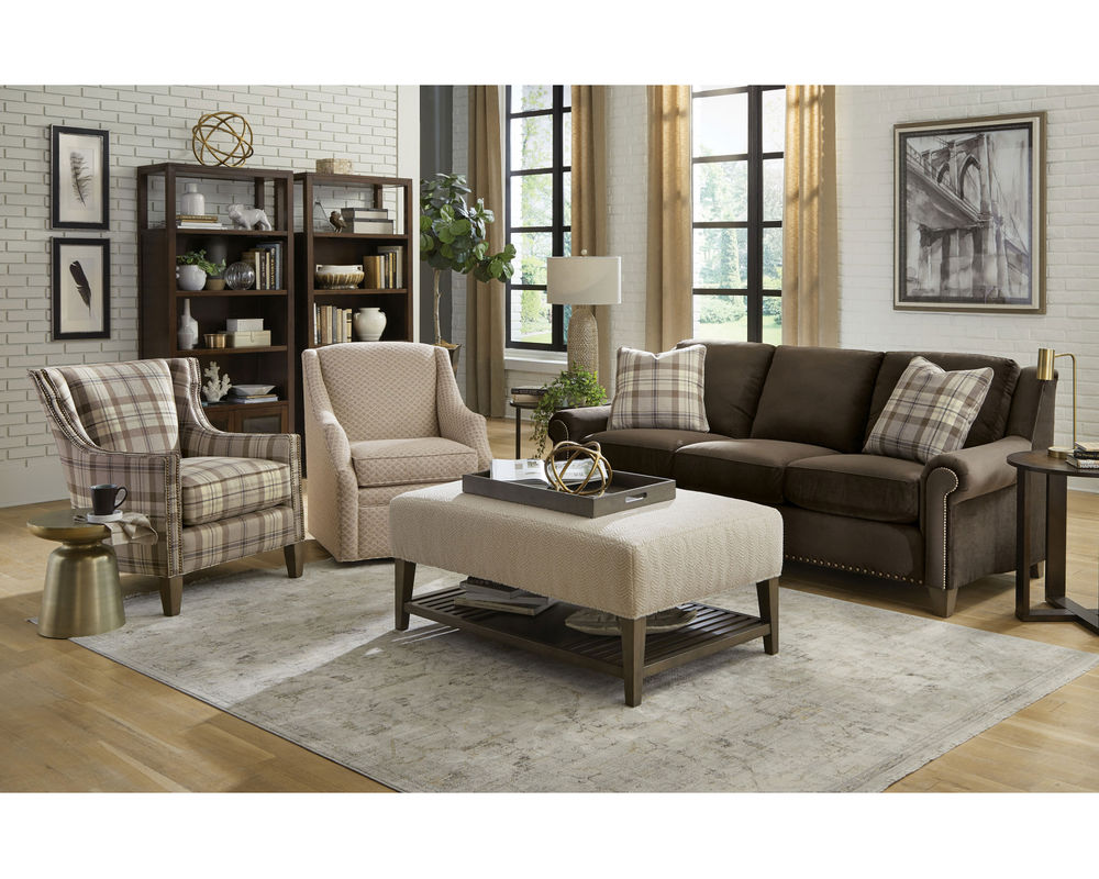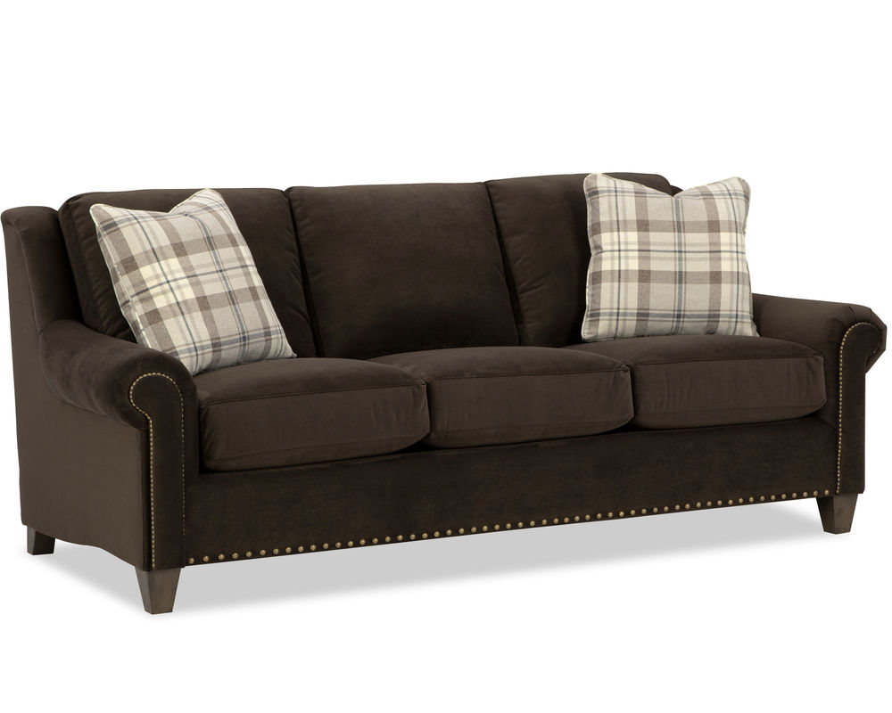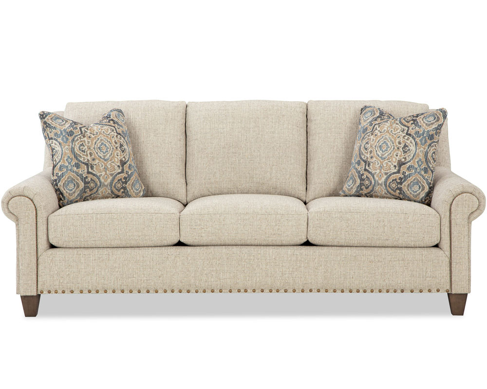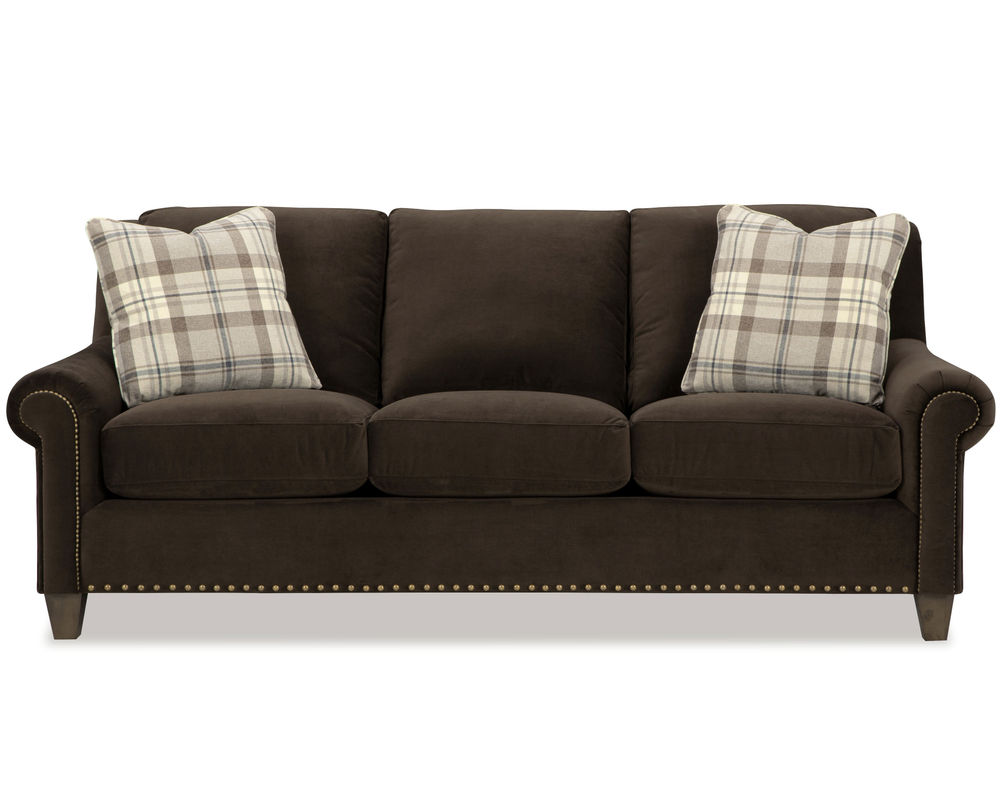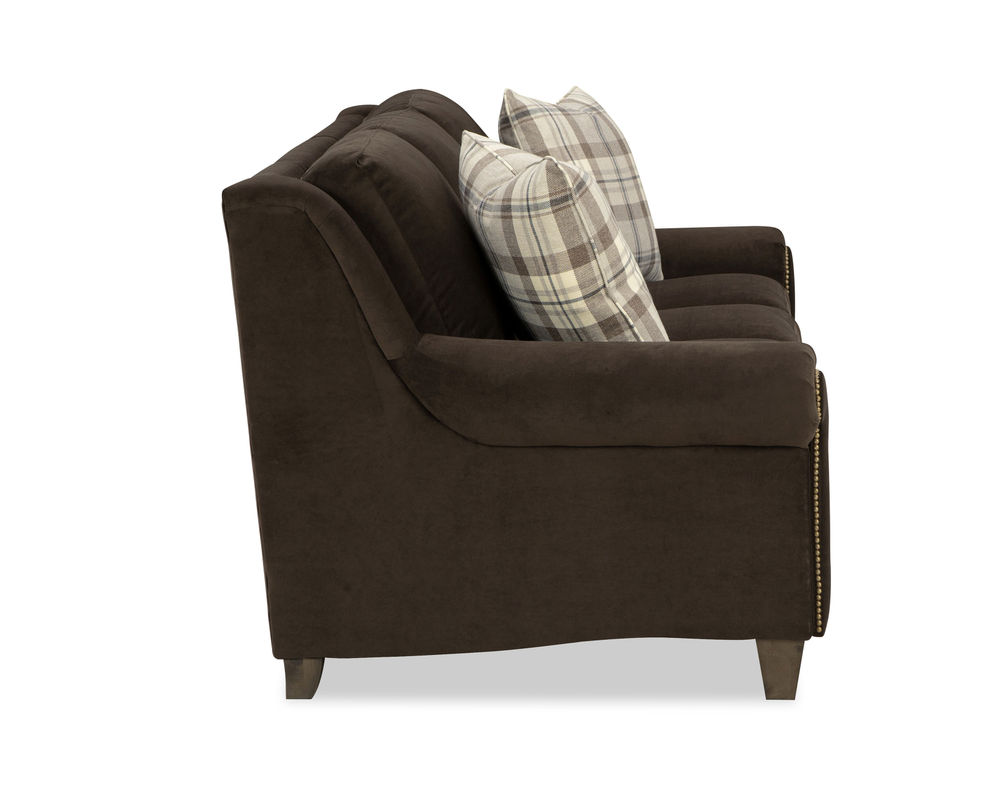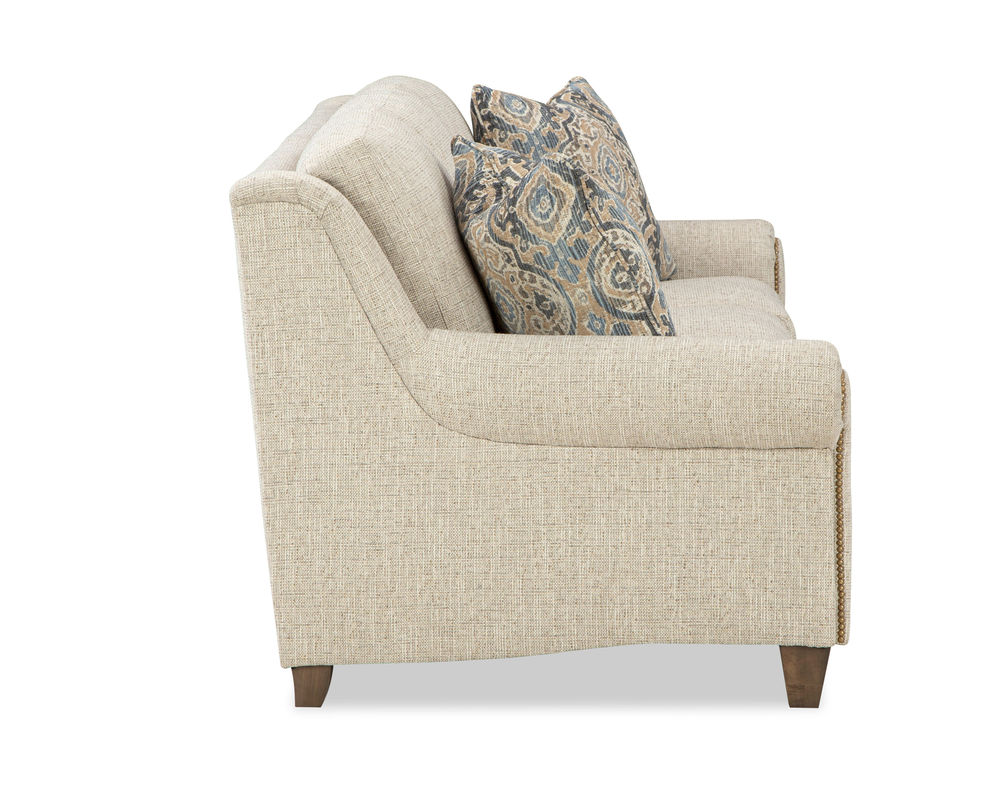 The Swift 7309 Sofa is the perfect combination of classic elegance and modern comfort. This timeless piece is accented with beautiful details, such as offset arm panels lined with nailhead trim and subtle wings that provide cozy comfort. The front rail is trimmed with nail heads for a touch of craftsmanship, and French seaming and tapered legs give the sofa a clean and elegant look. For ultimate comfort, the sofa is cushioned with plush cushioning and attached back pillows and comes with two toss pillows as standard. If desired, the sofa is also available without nail head trim. Additionally, the perfect accompaniments to the sofa are available: a matching loveseat, chair, and ottoman. With the Swift 7309 Sofa, you can easily achieve a timeless yet modern look.