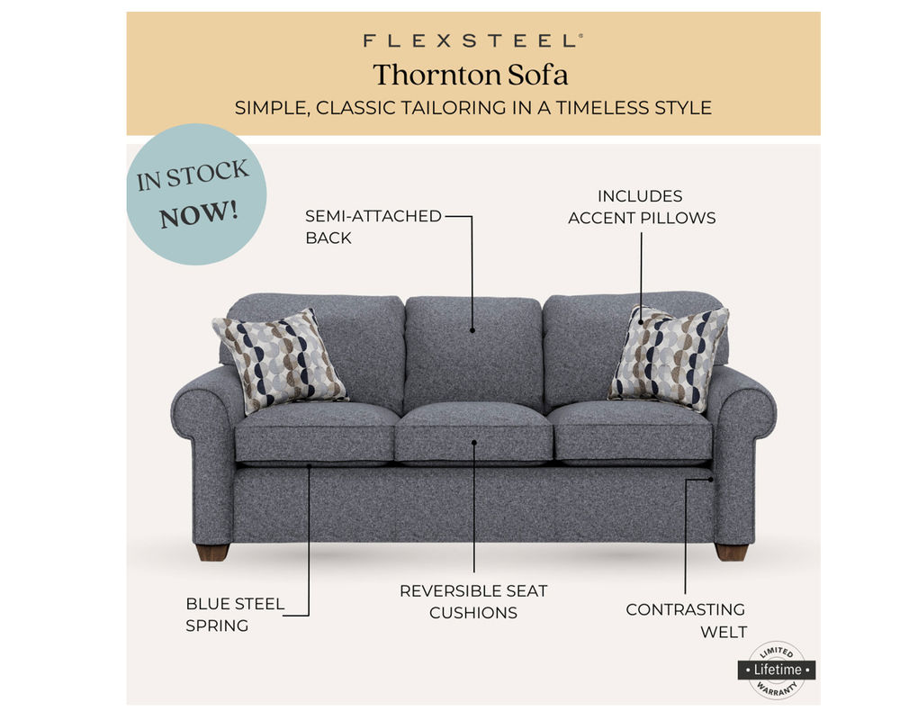 And the best part? The Flexsteel Thornton 5535 Sofa is in stock and ready for fast delivery. No need to wait weeks or even months for your new sofa - you can have it in your living room in no time. So why settle for a mediocre sofa when you can have the comfort, style, and durability of the Thornton? Upgrade your living space today with this timeless piece.