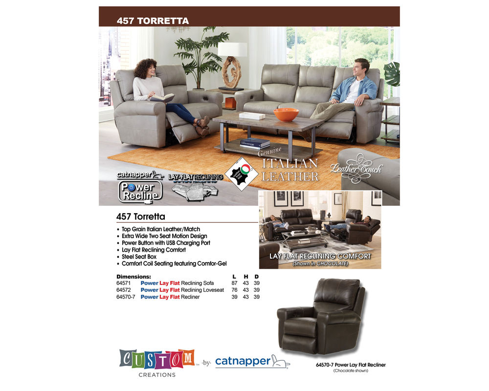 Top Grain Italian Leather everywhere your body touches. Extra wide two seat motion design with a Lay Flay (like a bed) reclining mechanism. Includes dual power recliners with USB charging ports. Quality start on the inside... steel seat box with Comfort Coil cushions featuring Comfor Infused Gel.