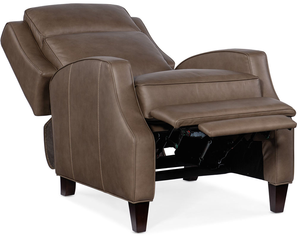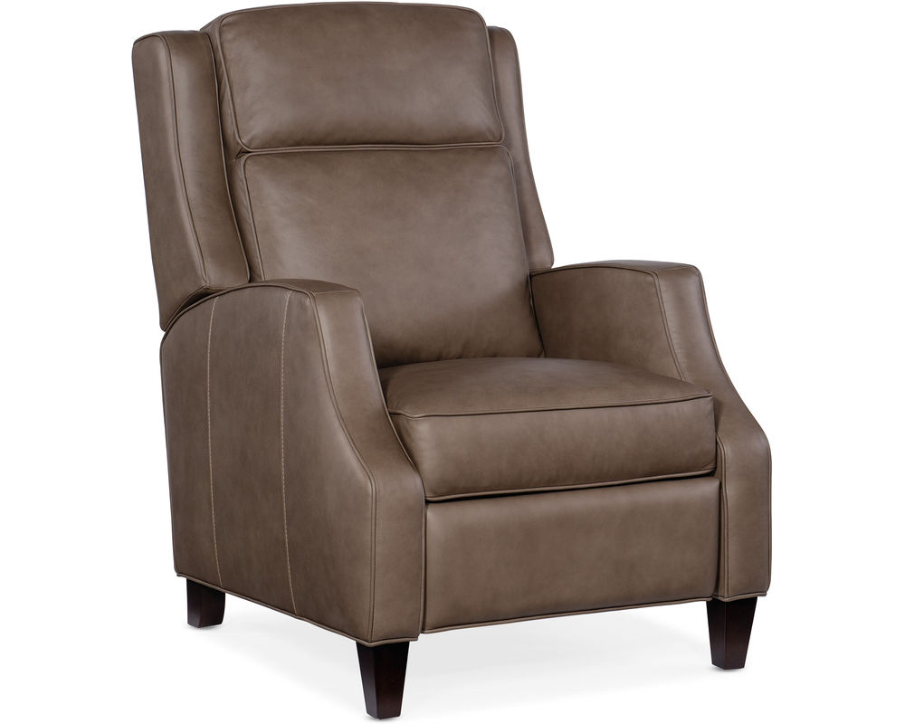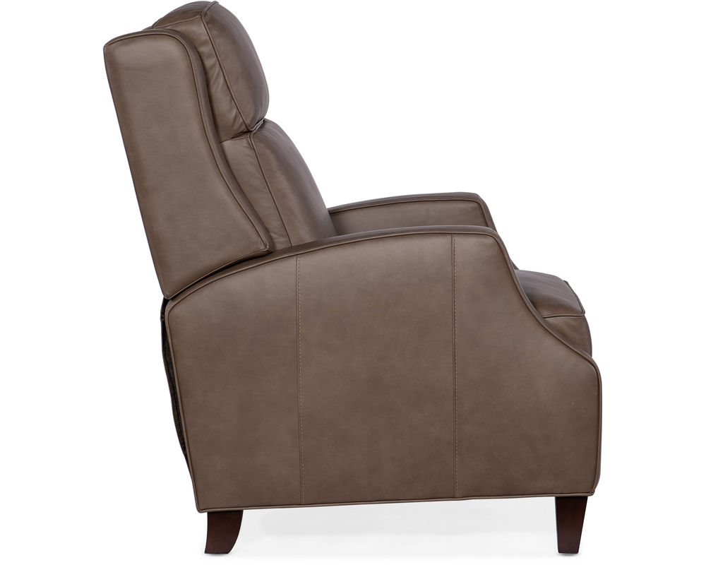 Sophisticated style meets everyday comfort with the Tricia Push Back Recliner. Upholstered in Aspen Lenado Finished Top Grain Leather, this recliner offers a rich, supple feel with long-lasting durability. Its manual push-back reclining mechanism provides effortless relaxation, while the bustle back design offers plush support. Accented with welt trim and tapered wood legs, the Tricia recliner combines timeless elegance with practical comfort, making it a perfect addition to any living space.