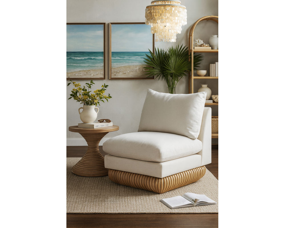 The Tulum Rattan Swivel Chair combines modern elegance with the natural beauty of rattan craftsmanship. Its sculptural rattan base, available in 28 custom finishes, anchors a generously cushioned seat designed for everyday comfort. Featuring a Blendown cushion with a foam core wrapped in a feather blend, the Tulum delivers both softness and durability. The smooth swivel motion adds versatility, making this chair a perfect fit for casual, coastal, or transitional spaces. Proudly handcrafted in the USA, it offers customizable fabrics and finishes to suit your home.