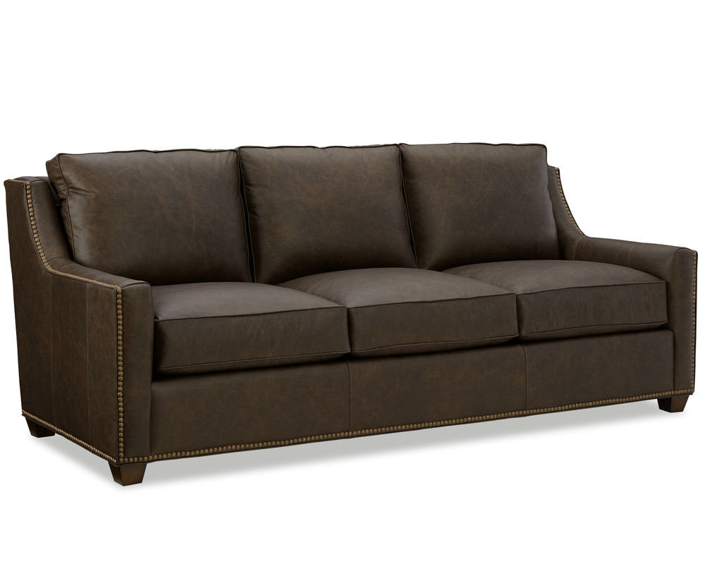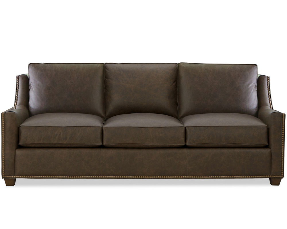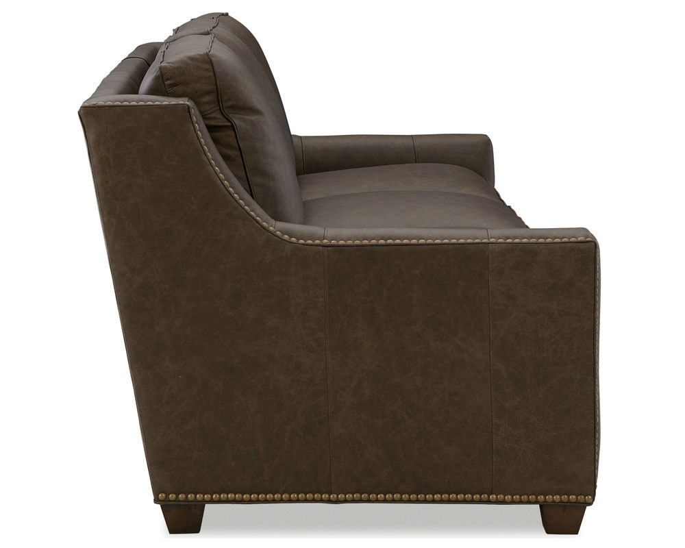This Tucson 7029 Leather Sofa is the perfect addition to any living room. Its sophisticated style, featuring a box border back and nail head trim along the arms and base, is sure to be the center of attention. The sofa also comes with low block feet and our premium Blend Down coil seat cushions for maximum comfort. This sofa is also available in a matching loveseat, chair 1/2, and ottoman, and without nail head trim. All of these pieces are made from 100% top-grain leather, ensuring high quality and long-lasting durability. Whether you're looking to update your living room or just add a touch of style, this Tucson 7029 Leather Sofa is the perfect choice.