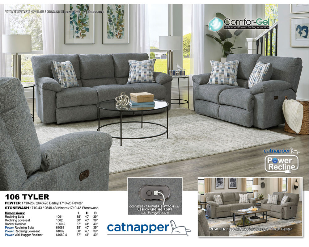 Introducing the Tyler Reclining Collection by Catnapper Furniture! This collection offers top quality furniture at an affordable price. The Tyler Reclining Sofa is a great addition to any living space. It features a soft chenille fabric and designer toss pillows for added comfort and style. With the power recline feature, you can adjust the sofa to your desired position for ultimate relaxation. Whether you're watching tv, reading a book, or simply lounging, the Tyler Reclining Sofa will provide the perfect spot to unwind. It is sure to become the centerpiece of your living room.