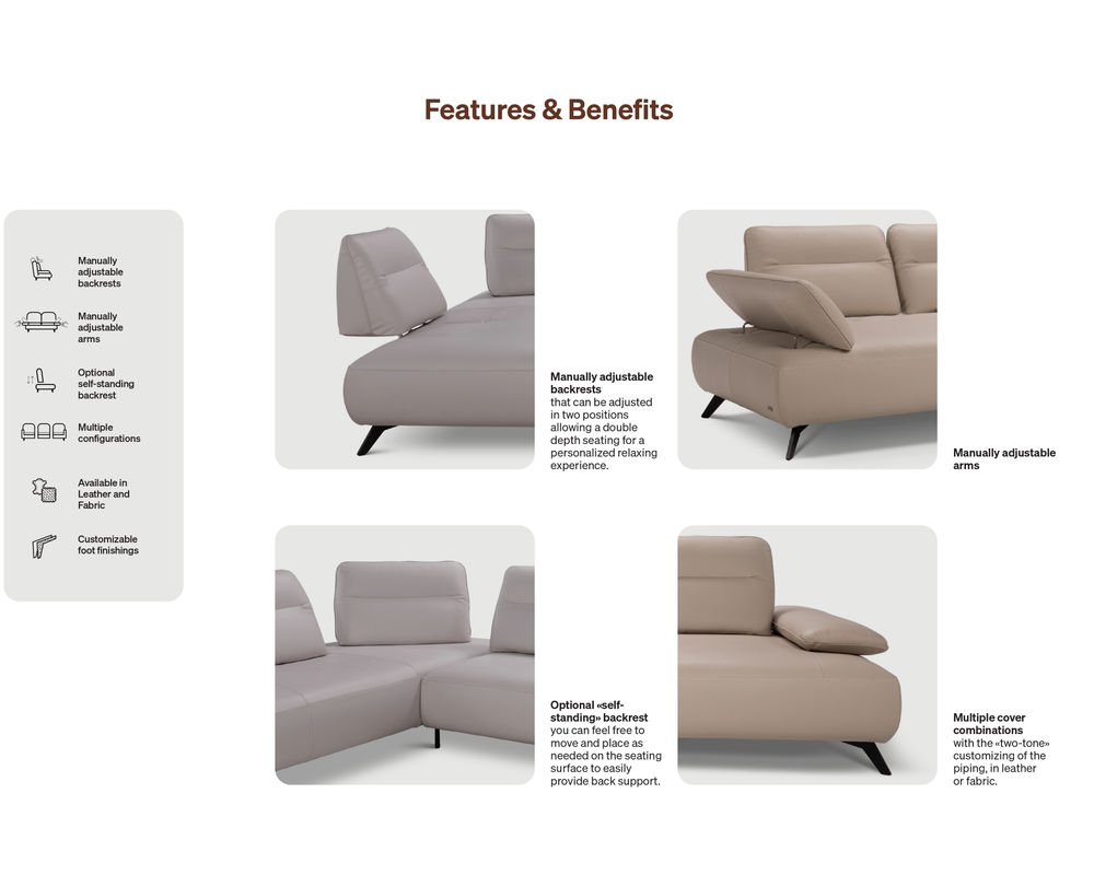 The result is a sofa that intuitively adapts to your body and lifestyle, delivering both visual lightness and everyday ease. Available in luxurious top-grain leathers, premium fabrics, or a two-tone mix with contrasting or tone-on-tone piping, Valencia brings the spirit of modern Italian living to your home.