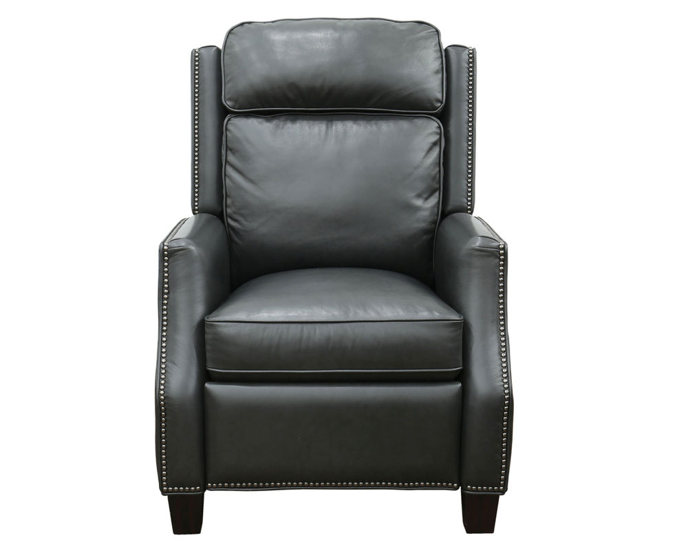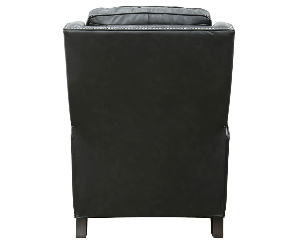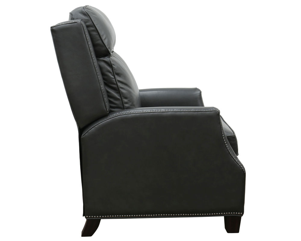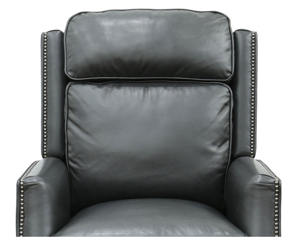 Introducing the Van Buren Leather Recliner, a perfect blend of style and comfort. This sophisticated recliner features a high-back design with push-through arms and an articulated headrest for superior head support. The wings, side rails, arms, and ottoman are accented with welts and nailhead trim, adding a touch of elegance to the overall design.