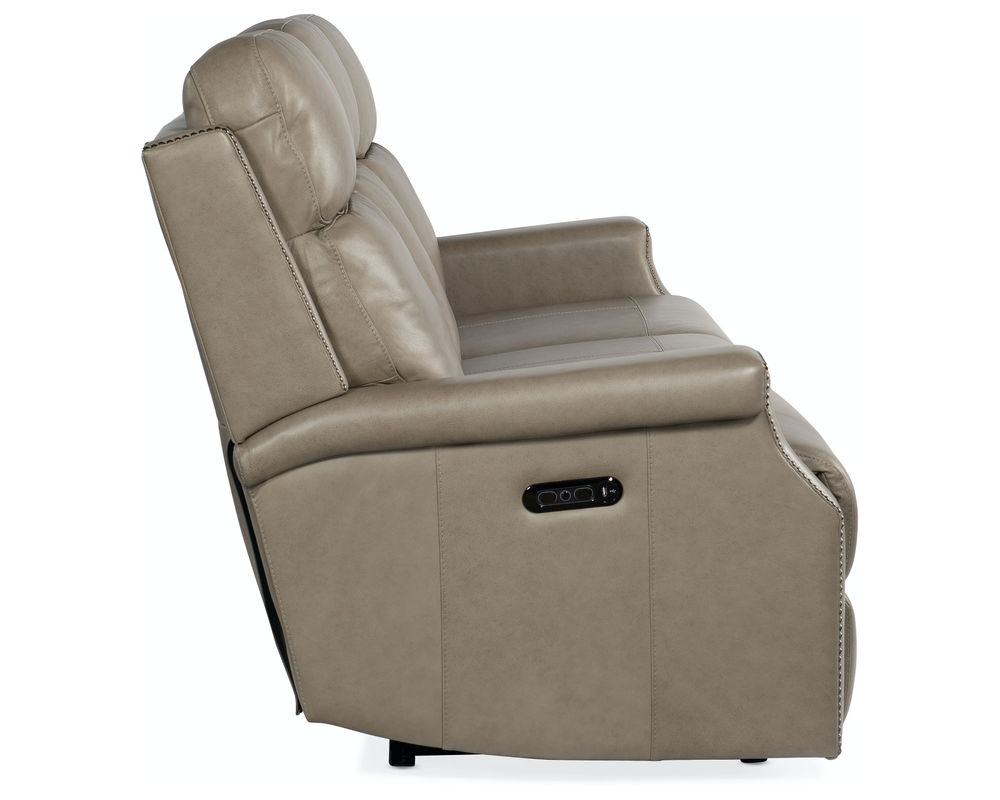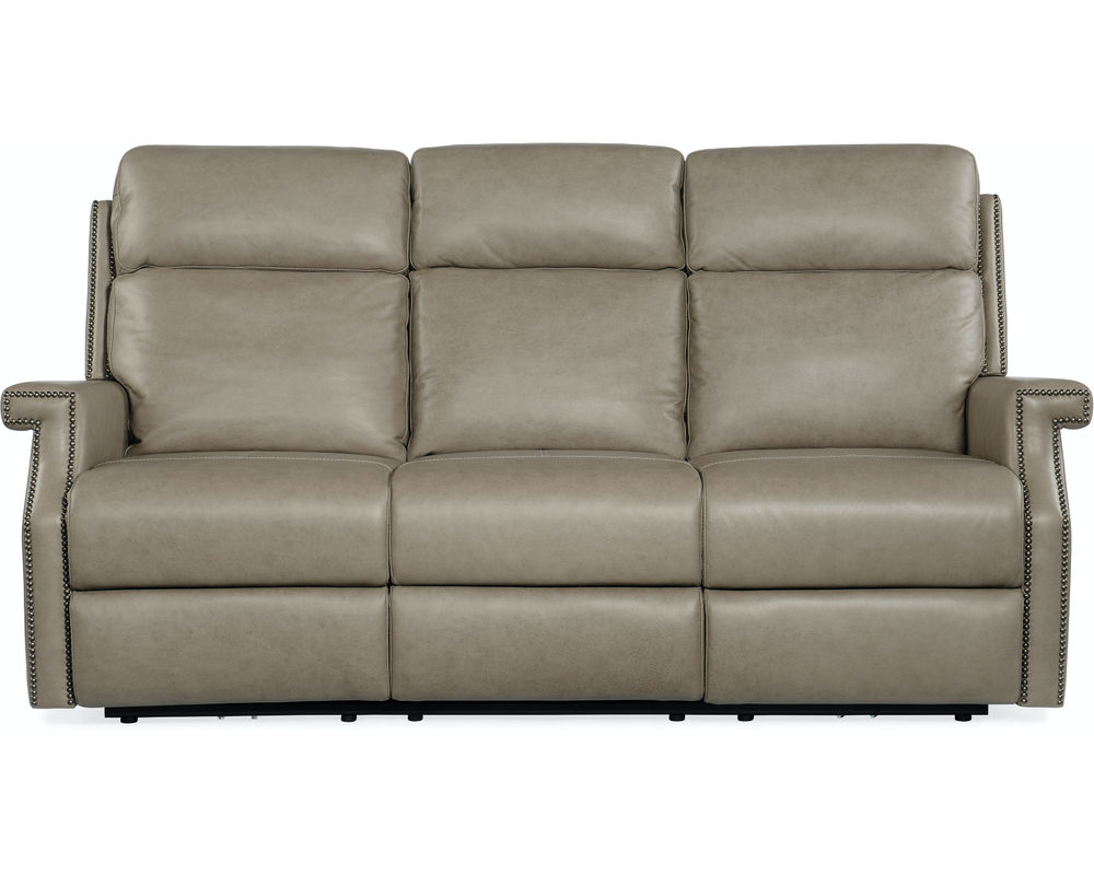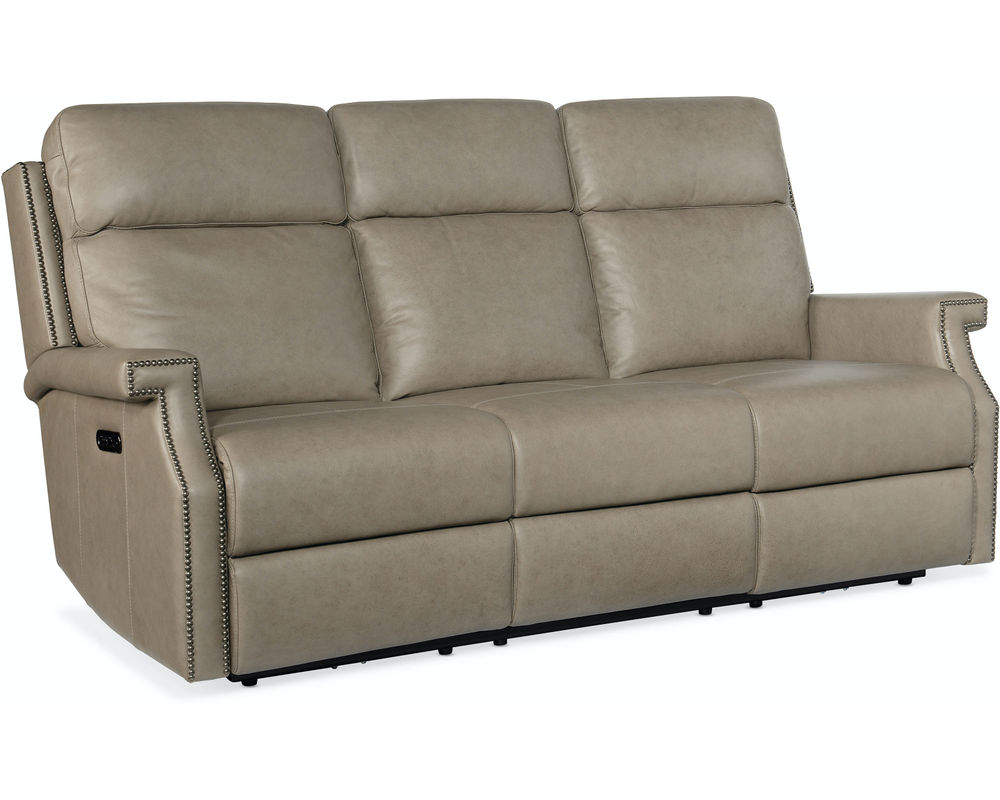 In a chic transitional, well-tailored design, the Vaughn Zero Gravity Sofa with Power Headrest is offered in the soft, butterscotch-colored finished top grain leather called Shattered Stone. Reclining at the touch of a button with a zero-gravity feature that gives you the feeling of being suspended in air for maximum comfort, the recliner has a bustle-style back and vintage gold nailhead trim. Includes USB port to charge your device while you relax.