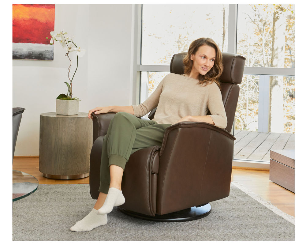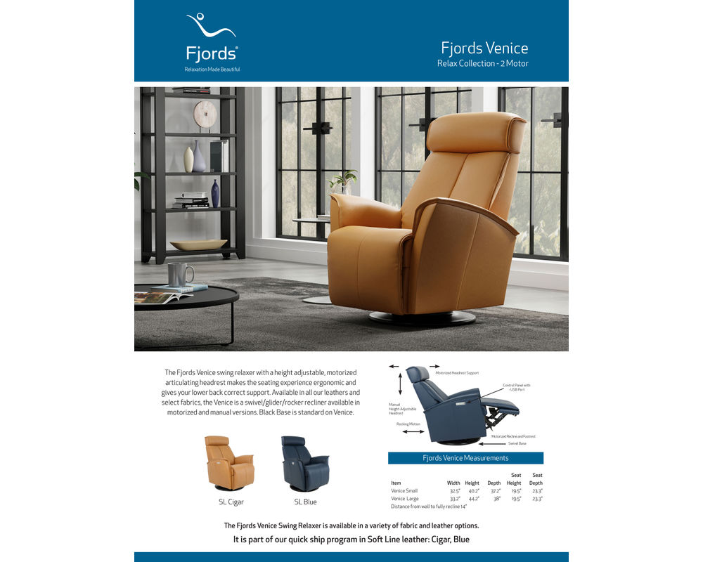 The Venice Swivel Glider Recliner from Fjords blends clean Scandinavian design with exceptional comfort and smooth, effortless motion. Designed to support the body naturally, the Venice features an ergonomic high back and adjustable head support that promote proper posture while you relax. Its gentle gliding and swivel motion allow the chair to move fluidly with you, creating a soothing, balanced seating experience whether you’re reading, watching TV, or unwinding at the end of the day. Built with Fjords’ premium cold-cured foam and quality internal construction, the Venice delivers consistent comfort, long-term durability, and a refined look that fits beautifully into modern and transitional living spaces.