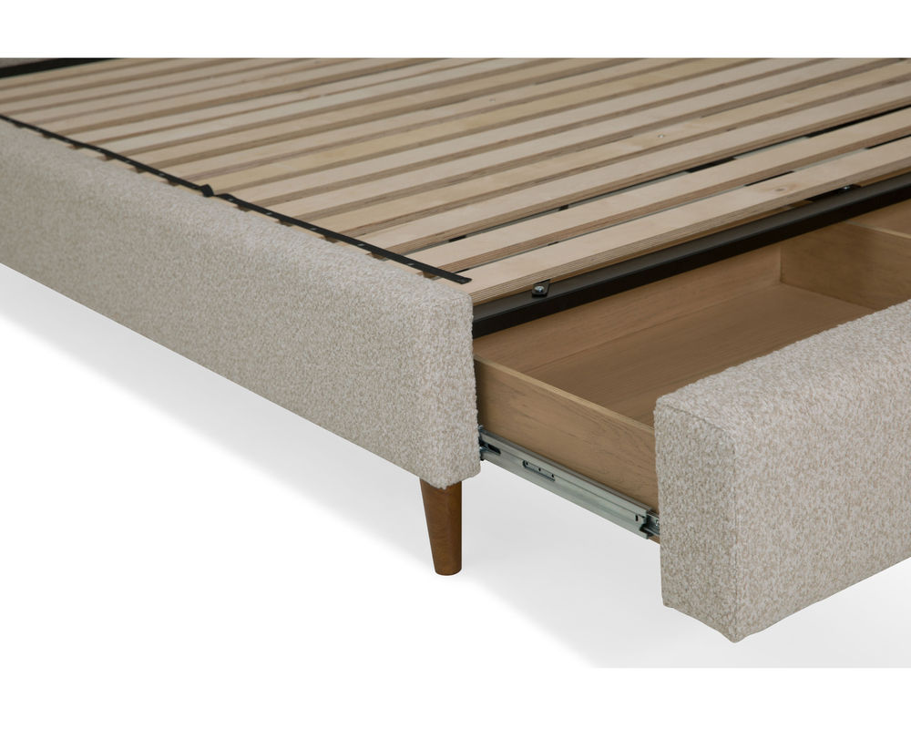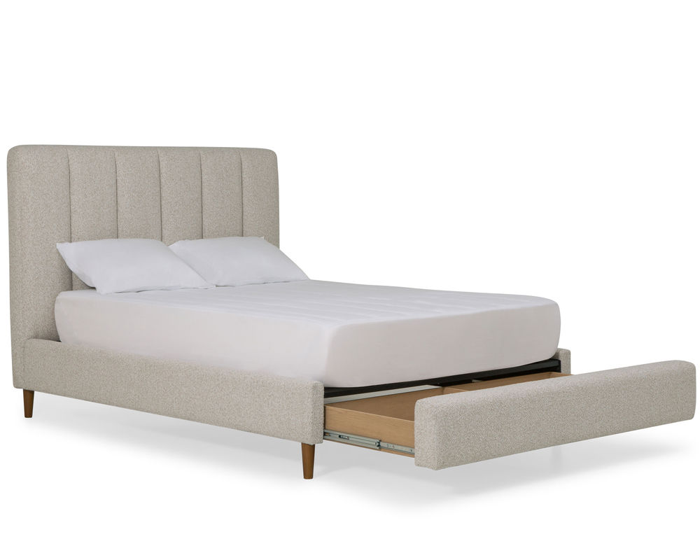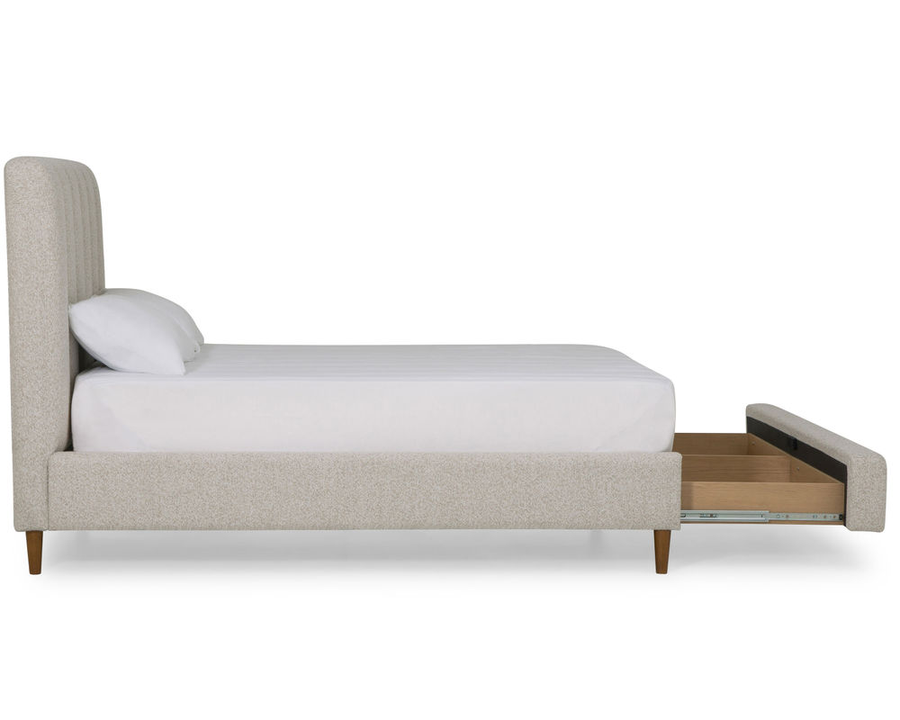 From Sofas and Sectionals.com: Introducing the Verttia Complete Bed with Drawer Storage—the perfect combination of style and functionality. This bed features a convenient drawer storage at the end, providing extra space to store your belongings. The pull-out drawer storage measures 66" deep.