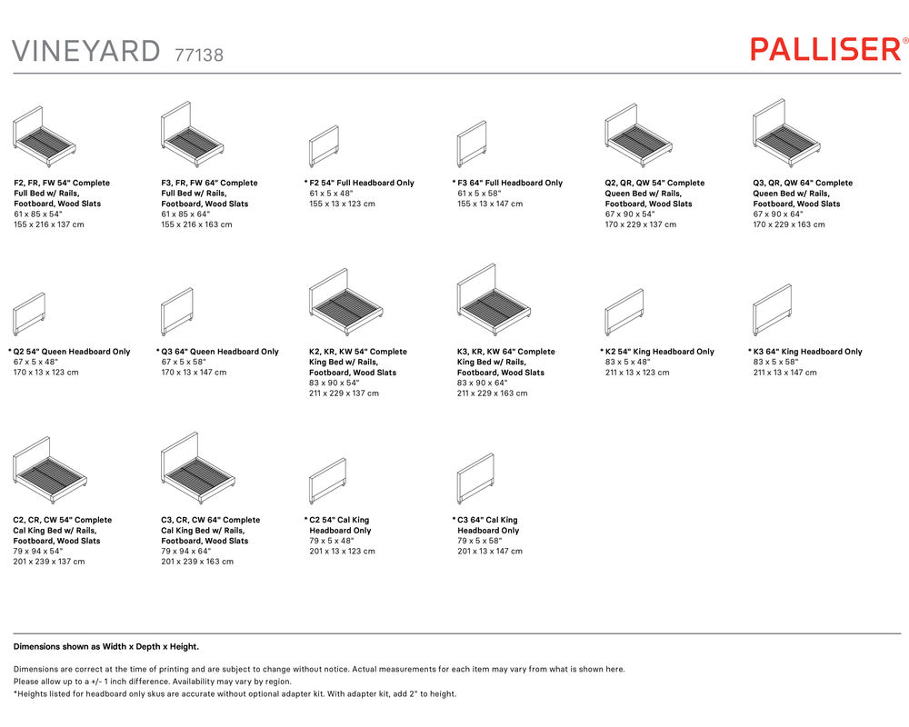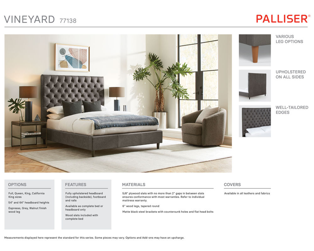 Choose from 175 fabrics and leathers to customize your Vineyard bed to match your style and bedroom decor. This bed is available in Full, Queen, King, and California King sizes, making it a versatile and stylish choice for any bedroom. Upgrade your sleeping experience with the Vineyard Complete Bed and add a touch of luxury to your home.