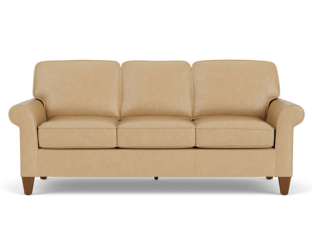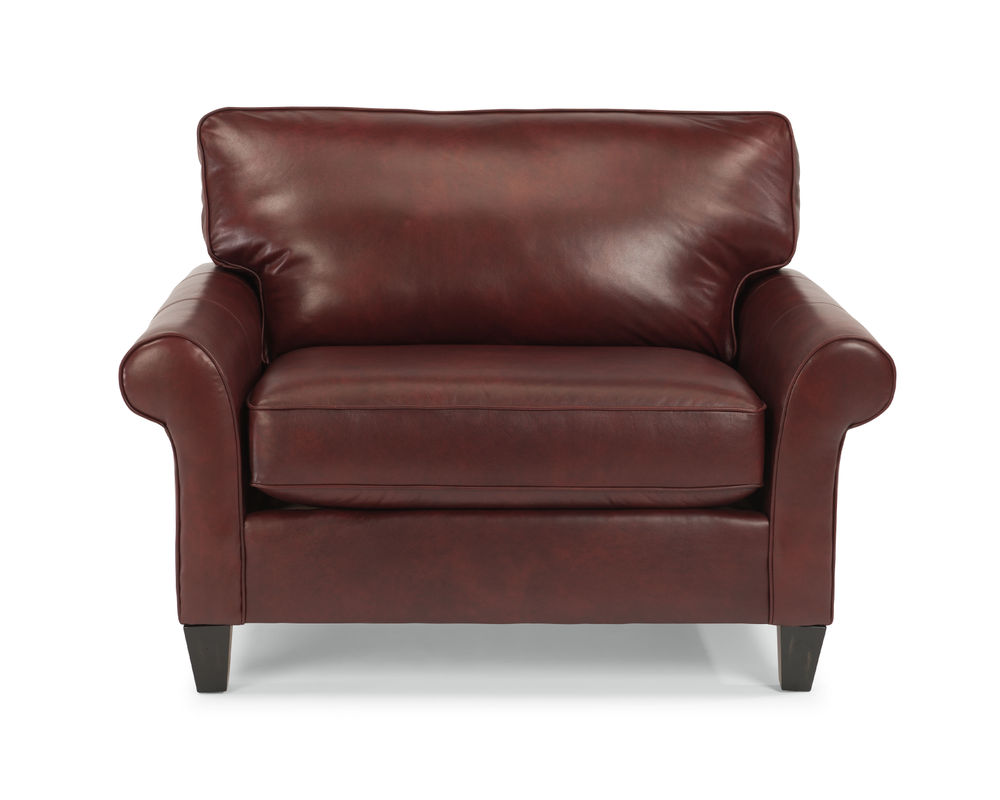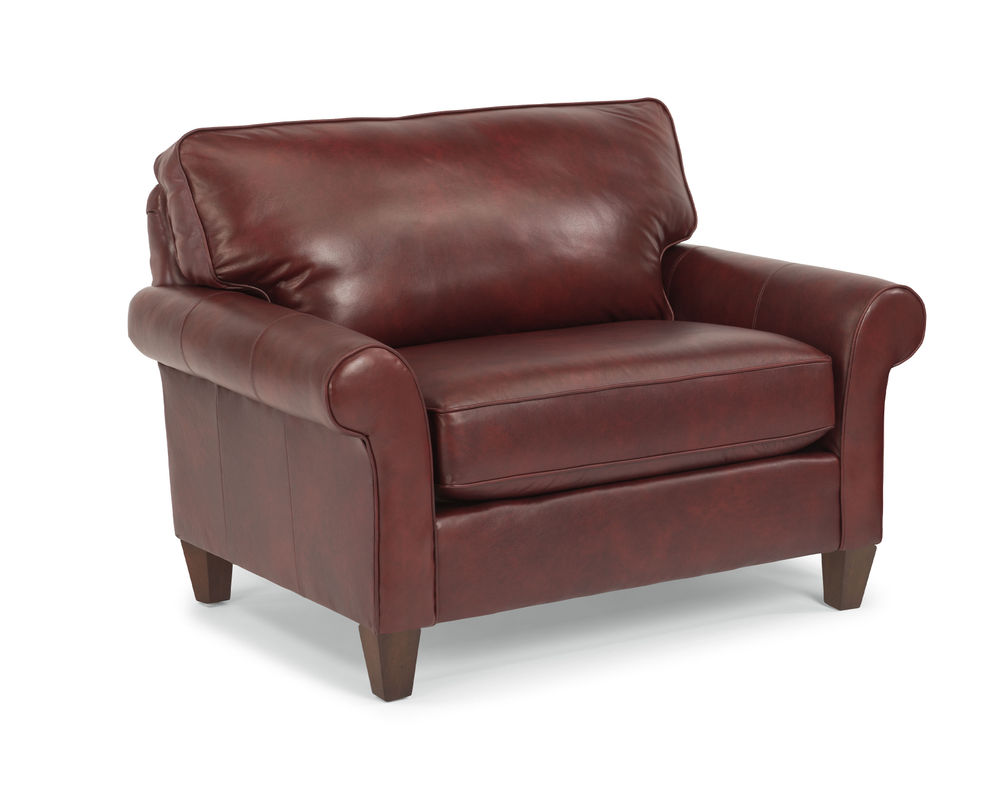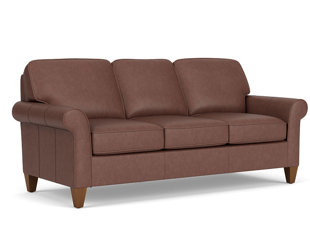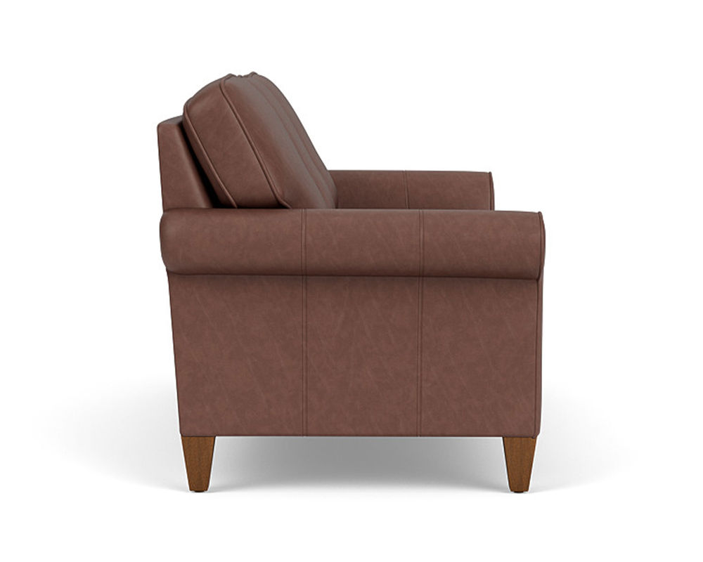Lean back and look sophisticated in this Westside classic. Rolled arms and tapered wooden legs elevate an angled profile so you can sit back and relax elegantly. Soft boxed seat and back cushions paired with quality construction provide years of comfortable seating for you and your family. Flexsteel only uses the finest leathers guaranteed to last. Over 40 leather colors to select from.