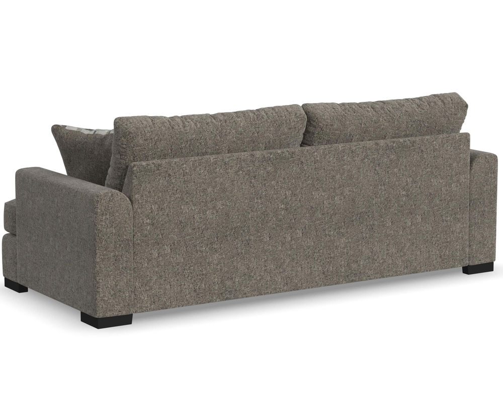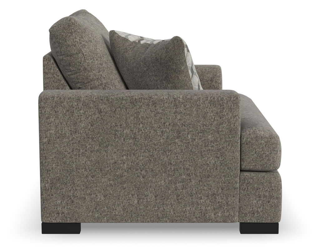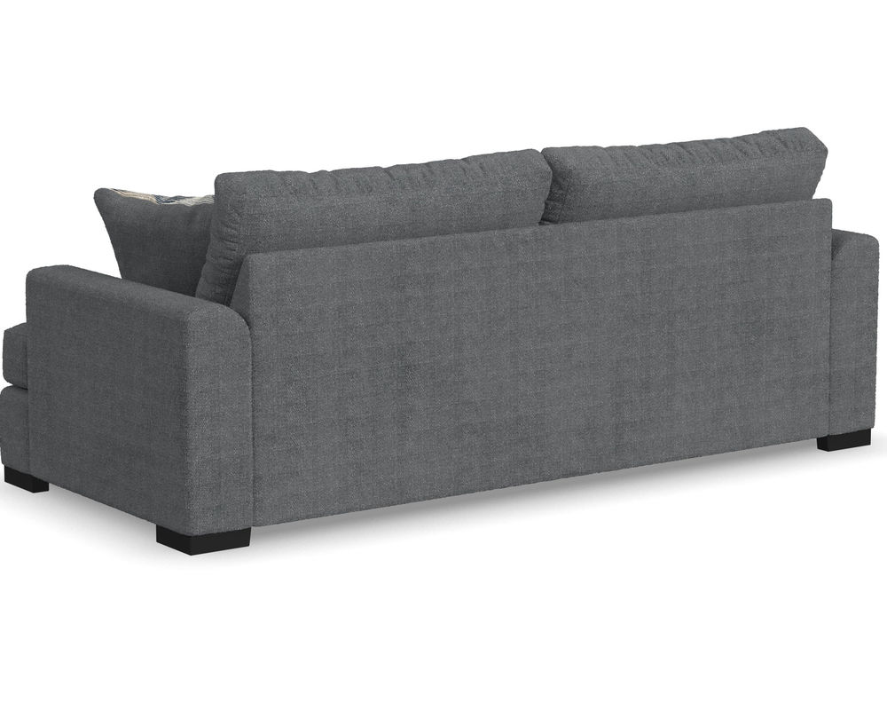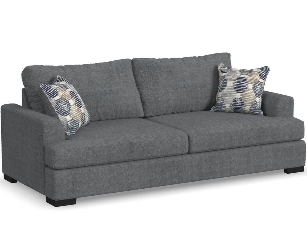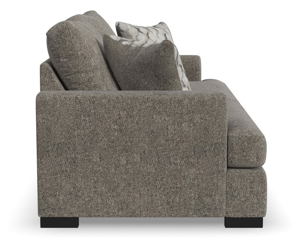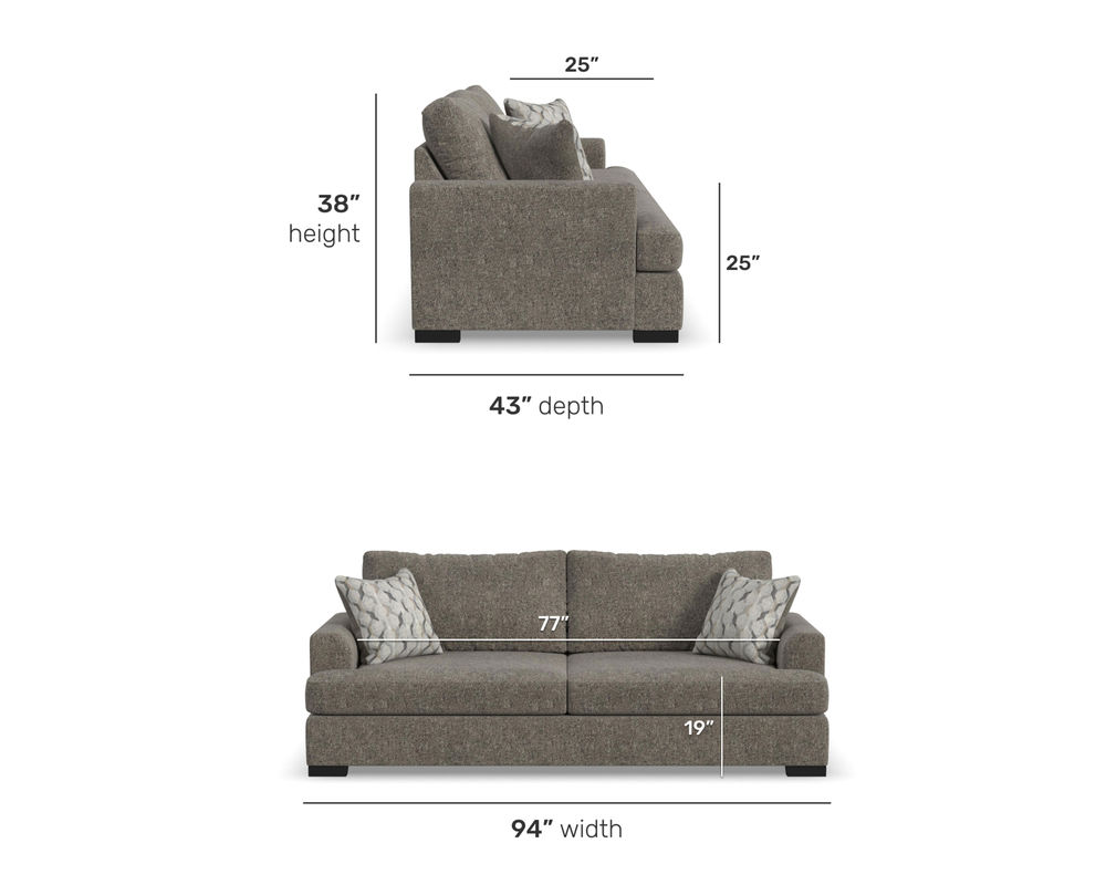 From Sofas and Sectionals.com—Experience the ultimate laid-back comfort with the Willow 94" Sofa. This stylish piece features a deep seat and soft flare arms for a breezy look to elevate your home decor. The sofa is designed with two wide, loose back cushions for a more contemporary aesthetic, while the two wide, deep, and durable seat cushions invite you to sink in and relax. The low-to-the-ground design is complemented by black recessed block legs, adding a touch of modern sophistication. Choose from two carefully selected fabric combinations to make it yours and personalize it with the two-sided accent pillows. Add the Willow 94" Sofa to your living room and enjoy the perfect balance of style and comfort.