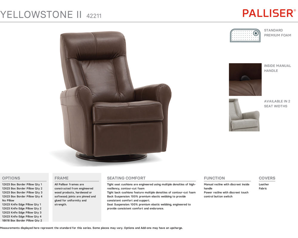 • All Palliser cushions are crafted to rigorous quality standards for superior comfort, support, and endurance. High-density, high-resiliency seat foam is used to ensure years of quality seating.
