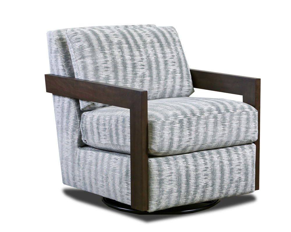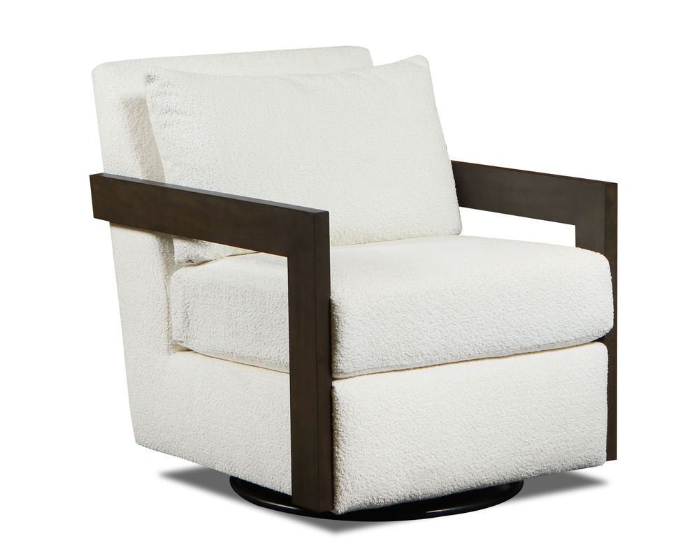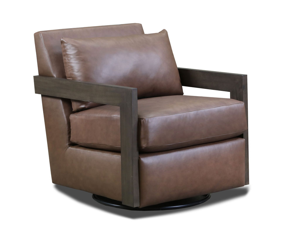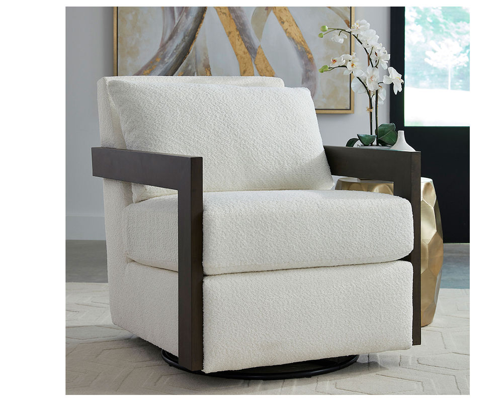 Introducing the Zara Swivel Chair, a dramatic focal point that will add a touch of elegance to any room. This chair is designed for comfort, with a relaxed sitting position and plush comfort cushions filled with Energex. Its low-slung silhouette swivels more than 180 degrees, allowing you to admire its beauty from any angle. The exposed wood arms in bold proportions provide the perfect frame for this timeless piece. Whether you're entertaining guests or lounging with a good book, the Zara Swivel Chair will be your go-to seat for maximum comfort and style.