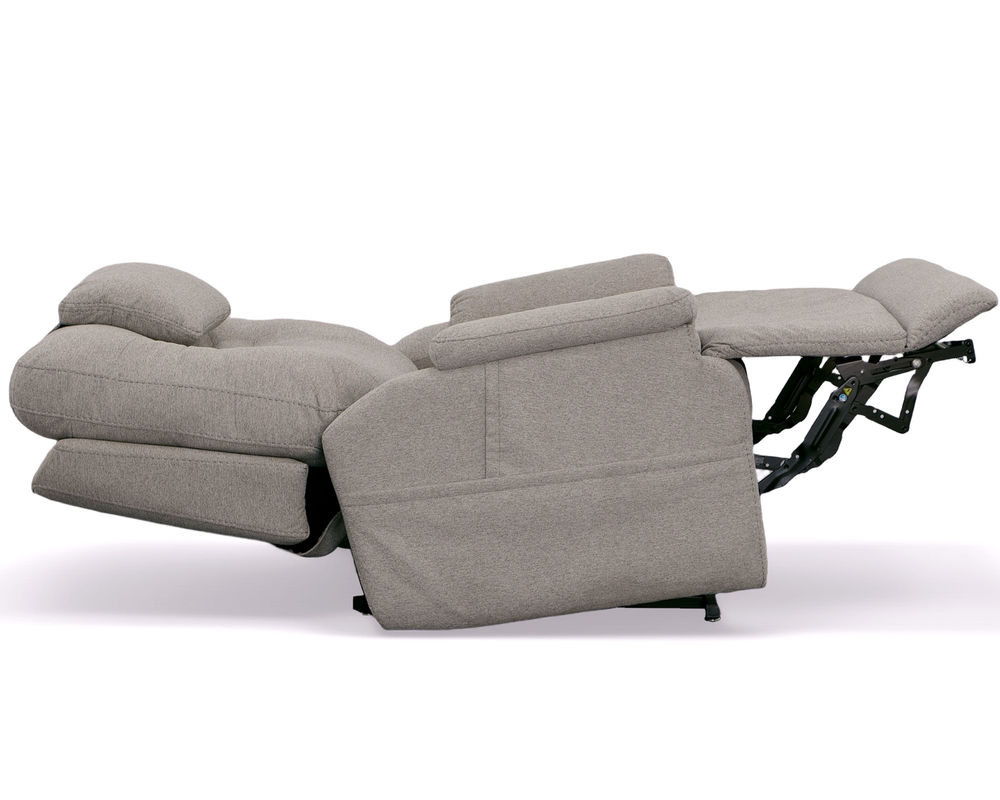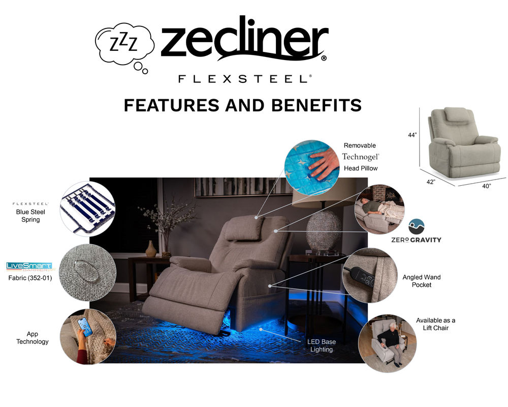 Cozy up in the Zecliner Model 2 Power Sleep Chair, your perfect family recliner by day and haven for peaceful sleep by night. The zoned memory foam comfort areas in the backrest, seat, and shoulders, removable cooling head pillow, padded arms, and waterfall chaise make the Zecliner a piece of unparalleled luxury. The hand wand control lets you customize your comfort, while Zero Gravity puts you in a state of weightlessness. With Flexsteel's patented Blue Steel Spring™ at its core, this recliner has surrounding comfort for relaxation and slumber. Reliable performance fabric upholstery repels stains and spills while being easy to clean. Achieve blissful relaxation by day and a rejuvenating sleep by night with the Zecliner, and indulge in the luxurious comfort it provides.