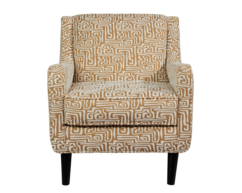 The chair features sloped arms with an outside arm welt, adding a touch of elegance and sophistication to its overall design. The tight back and box-border seat cushion provide excellent support and comfort, making it the perfect spot to relax after a long day. The loose cushion adds a playful element to the chair, while the fun pattern and coffee-finish splayed legs add a pop of color and personality.