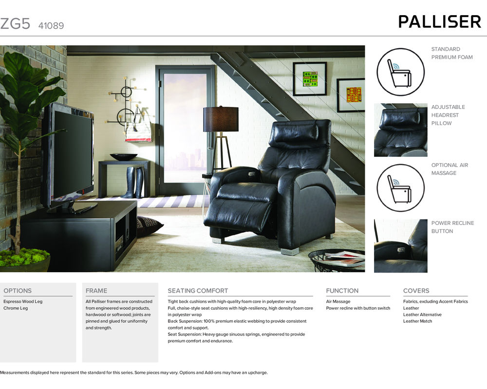With Palliser Furniture, you not only get a high-quality product, but also peace of mind. Our warranty covers ten (10) years for the internal frame construction; two (2) years for the cushioning, mattresses and sleeper mechanisms, stitching, manual and/or electric mechanisms, the suspension system (webbing/springs), exposed wood trim, and fabric coverings. After the first year from the date of purchase, this warranty covers only parts and materials necessary for repair and does not cover labor. This comprehensive warranty demonstrates our confidence in the durability and quality of our products.