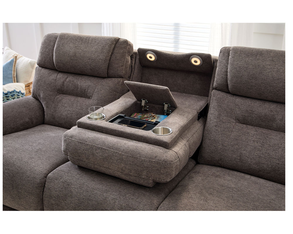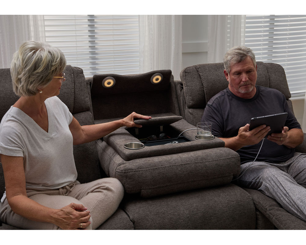 • The center, drop-down back cushion contains touch lighting, two cupholders, a wireless charging tray, and USB-A and USB-C ports
